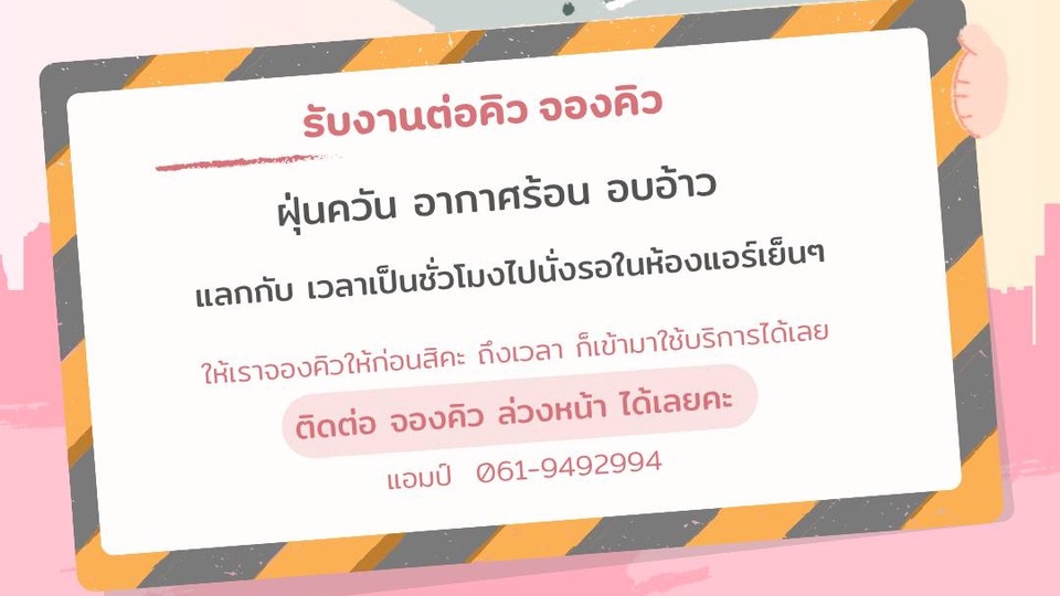 รับจองคิวร้านอาหารและร้านดังยอดฮิตทั่วกรุงเทพฯ สะดวก รวดเร็ว ให้คุณได้ลิ้มลองเมนูเด็ดโดยไม่ต้องยืนรอคิวให้เมื่อย พื้นที่ให้บริการ: - จตุจักร - บรรทัดทอง - ทรงวาด ขั้นตอน: 1. แจ้งชื่อร้านและวันเวลาที่ต้องการ 2. ตรวจสอบคิวว่าง 3. ดำเนินการจองให้ทันที