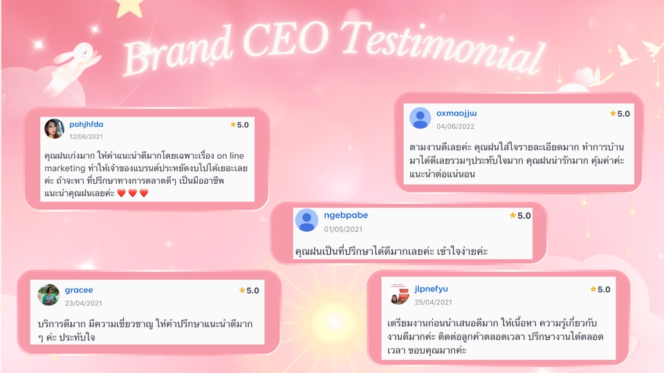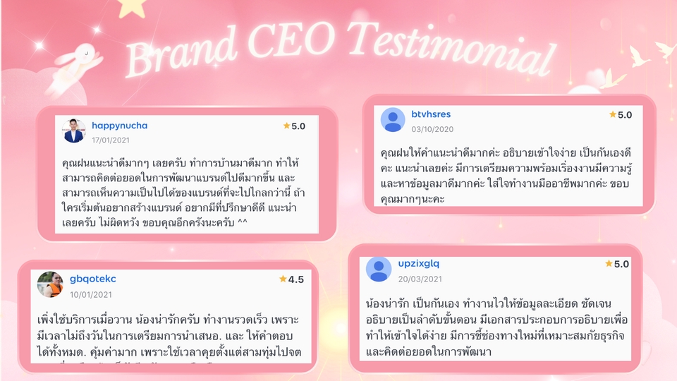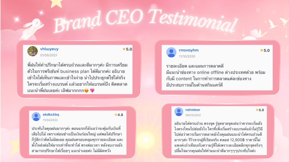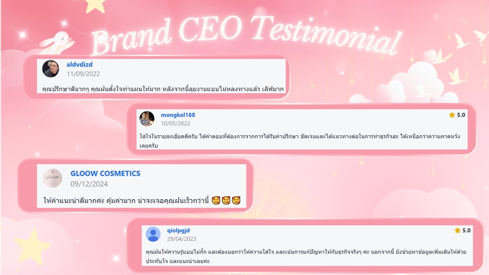 ให้คำปรึกษาสำหรับผู้ต้องการเริ่มต้นทำธุรกิจเป็นเจ้าของแบรนด์สกินแคร์ เครื่องสำอาง และ อาหารเสริม 🔰โดยให้คำปรึกษาและวางแผนแนวทางธุรกิจเฉพาะเจาะจงแบรนด์ของลูกค้า วางแผนกลยุทธ์ให้ทำตามได้จริง ✔️ สร้างธุรกิจของลูกค้าให้มีความโดดเด่น แตกต่าง โดยให้คำปรึกษาตั้งแต่ระดับเริ่มต้นตั้งแต่ เริ่มคิด Branding Concept จุดยืนที่โดดเด่น ของแบรนด์และสินค้า ✔️ วางแนวทางด้านผลิตภัณฑ์ เกิดสินค้าที่โดดเด่น แตกต่างจากท้องตลาด เกิดภาพที่ลูกค้าจดจำได้ง่ายและเข้าถึงลูกค้า ✔️ วิเคราะห์ตลาดและกลุ่มเป้าหมายลูกค้าของแบรนด์ที่เหมาะสม รวมถึงราคาขายที่เหมาะสมอีกด้วย ✔️ วางแผนกลยุทธ์ การตลาด การขายที่เห็นผล นำไปทำตามได้จริง เพื่อสร้างยอดขาย และ สร้างแบรนด์สินค้าที่โดดเด่นในตลาด โดยใช้งบการตลาดที่น้อยและคุ้มค่าที่สุด!!ในช่องทาง Online Marketing เช่น TikTok Facebook IG Shopee และ ช่องทาง Offline Marketing ✔️ วางแผนกลยุทธ์ การขาย การตลาด สำหรับแบรนด์ที่ต้องการสร้างตัวแทนจำหน่าย หรือนายหน้าAffiliate และ วางเรทราคาตัวแทนจำหน่าย หรือ ค่านายหน้าที่เหมาะสม ✔️ ชี้แนะแนวทางการขยายตลาดสู่ตลาดที่ใหญ่ขึ้น ในการส่งออกสินค้าไปขายยังต่างประเทศ Export Business *หลังการบริการ ลูกค้าสามารถปรึกษาได้ตลอดฟรี!!* ขั้นตอนการทำงาน 1. พูดคุยรายละเอียดเบื้องต้นกับทางลูกค้าผ่านทางFastwork เมื่อลูกค้าตกลง ลูกค้าจึงทำการชำระเงินผ่านทางระบบFastwork 2. เมื่อลูกค้าชำระเงินแล้ว จะมีการโทรคุยสอบถามรายละเอียดของแบรนด์ และ สินค้าที่ลูกต้องการทำแบรนด์ในเบื้องต้น และ ส่งคำถามให้ทางลูกค้าตอบเกี่ยวกับสินค้าและแบรนด์ของลูกค้า 3. ลูกค้าส่งรายละเอียดคำตอบที่เกี่ยวข้องกับโปรเจคสินค้าและแบรนด์ของลูกค้า หลังจากนั้นฟรีแลนด์นำข้อมูลคำตอบที่ได้มาวิเคราะห์และวางแผนธุรกิจเฉพาะเจาะจงแบรนด์ของลูกค้า 4. นัดวันเวลาปรึกษาพูดคุยรายละเอียดของโปรเจค 5 ชั่วโมงเต็ม ตั้งแต่เริ่มจนจบโปรเจค โดยแบ่งPart การประชุมออกเป็นทั้งหมด 3 ครั้ง 5. ส่งไฟล์สรุปงานโปรเจคสกินแคร์และเครื่องสำอางของลูกค้า เป็นไฟล์(PDF) และอนุมัติผ่านทางFastwork 6. หลังจบการบริการ ลูกค้าสามารถปรึกษาได้ตลอดฟรีไม่มีค่าใช้จ่ายอีก