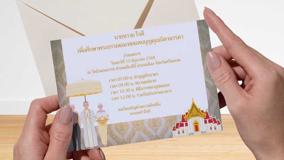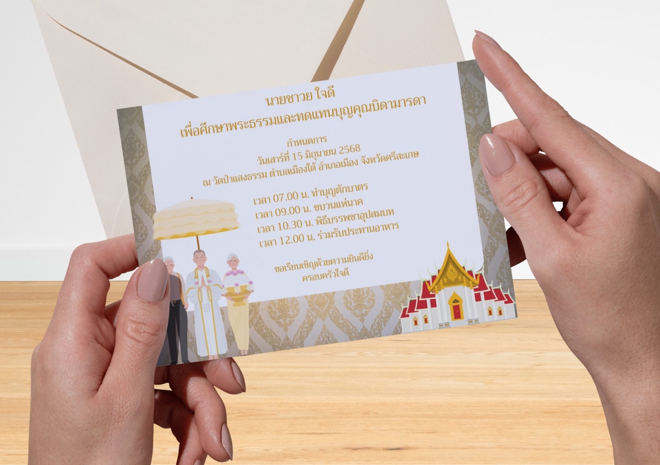 ช่วยให้ลูกค้าเข้าใจงานได้ชัดเจน การ์ดของตัวเองจะออกมาเป็นแนวไหน เช่น หวาน เรียบหรู มินิมอล หรือวินเทจ ช่วยลดความคลุมเครือ และเพิ่มความมั่นใจในการจ้างงาน ขั้นตอนการทำงาน 1. รับข้อมูลและความต้องการจากลูกค้า แอดจะพูดคุยและสอบถามรายละเอียดเกี่ยวกับงาน เช่น เป้าหมาย สไตล์ที่ชอบ สีที่ต้องการ รวมถึงงบประมาณและเวลาที่ต้องการใช้ เพื่อให้เข้าใจตรงกันตั้งแต่ต้น 2. ส่งแบบร่างให้ลูกค้าตรวจสอบและแก้ไข แอดจะออกแบบแบบร่างให้ดูภายในเวลาที่กำหนด และส่งให้ลูกค้าตรวจสอบ