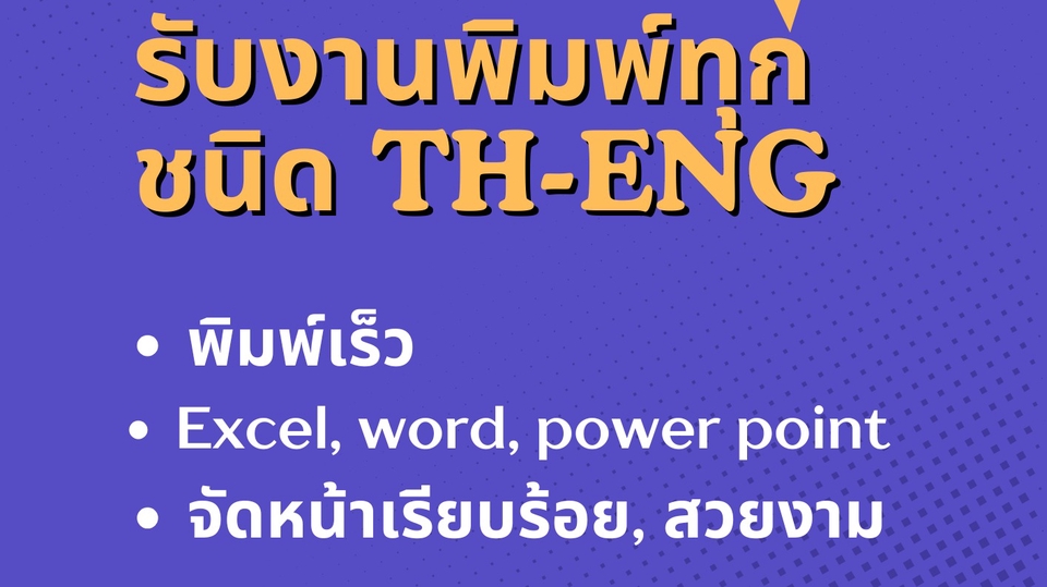 บริการของเรา เรารับพิมพ์งานทุกประเภท พร้อมจัดรูปแบบตามที่ลูกค้าต้องการ เช่น พิมพ์งานจากลายมือ / ไฟล์ PDF / รูปภาพ พิมพ์รายงานทั่วไป รายงานวิชาการ วิจัย บทความ พิมพ์ข้อมูลใน Excel เช่น ตาราง รายงานยอดขาย สต๊อกสินค้า พิมพ์เอกสารพร้อมจัดรูปแบบ Word, Excel หรือแปลงไฟล์ PDF 📌 สิ่งที่คุณจะได้รับ: ✅ งานพิมพ์เรียบร้อยตามต้นฉบับ ✅ แก้ไขงานได้ฟรี 1-2 ครั้ง ✅ จัดส่งไฟล์ Word / PDF ตามต้องการ ✅ ตรงเวลา ใส่ใจรายละเอียด 📌 สิ่งที่ต้องการจากลูกค้า: รูปภาพหรือไฟล์ต้นฉบับที่ชัดเจน รายละเอียดรูปแบบที่ต้องการ (เช่น ฟอนต์ ขนาด ตัวหนา/ตัวเอียง ฯลฯ) ขั้นต่ำขนาด 16 กำหนดเวลาที่ต้องการรับงาน 🔹 พิมพ์งานทั่วไป: 🔹 พิมพ์จากลายมือ / รูปภาพ 🔹 งานด่วน + เพิ่มเงินตามระยะเวลา 💬 สอบถามก่อนได้ ไม่มีค่าใช้จ่าย ยินดีให้คำแนะนำ