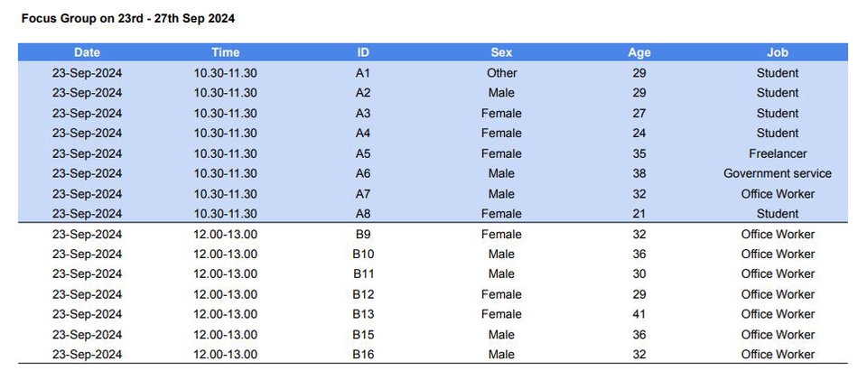 ฿1,500จัดหากลุ่มคนเพื่อเข้าร่วม focus group โดยตกลงกลุ่มเป้าหมายที่ต้องการ เช่น เพศ อายุ อาชีพ รายได้ และอื่นๆ ตามที่ต้องการ