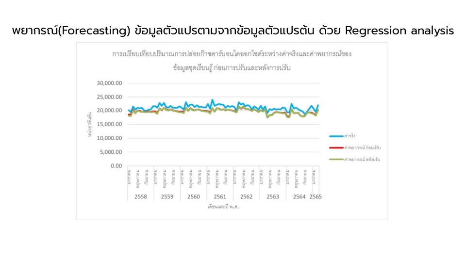 ใช้เทคนิค Regression Analysis เพื่อวิเคราะห์หรือพยากรณ์ข้อมูลที่อาจจะเกิดขึ้นในอนาคต โดยข้อมูลจะต้องเป็นข้อมูลที่มีตัวแปรต้น และตัวแปรตามจึงจะสามารถนำไปวิเคราะห์หาว่า ปัจจัยใดบ้างที่ส่งผลต่อตัวแปรตาม โดยตัวแบบที่ได้จะวัดผลจากค่า RMSE MAPE เป็นต้น