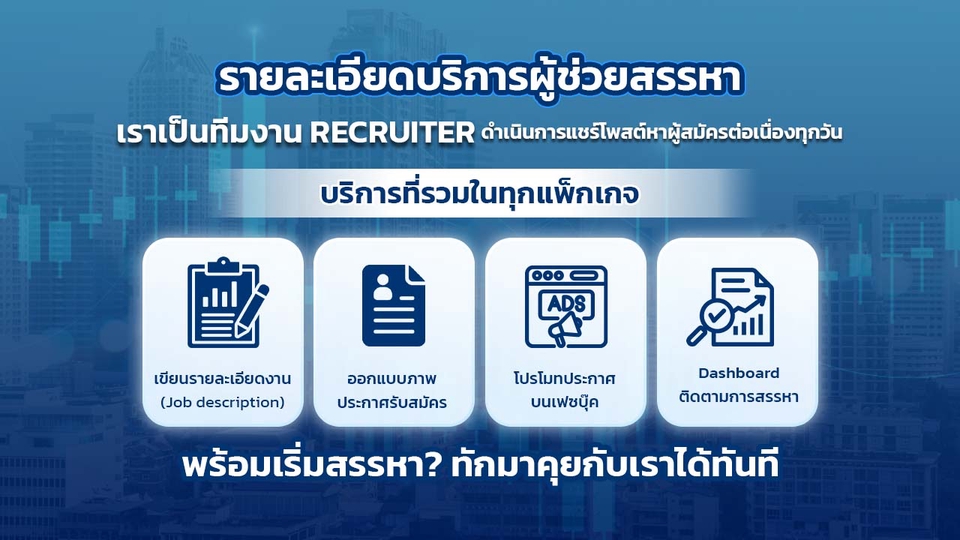 📌 บริการผู้ช่วยสรรหา | ช่วยคุณหาคนง่ายขึ้น โดยไม่ต้องเสียเวลาลองผิดลองถูก การหาคนทำงานไม่ใช่เรื่องง่าย โดยเฉพาะสำหรับเจ้าของธุรกิจหรือผู้จัดการที่ไม่มีทีม HR บางครั้งจะเริ่ม "โพสต์หาคน" ก็ไม่แน่ใจว่าจะเริ่มยังไง เขียนประกาศงานแบบไหนให้ดูน่าสนใจ หรือแม้แต่จะโพสต์ลงที่ไหนถึงจะเจอกลุ่มเป้าหมายที่ใช่ เราจึงออกแบบบริการนี้มาเพื่อเป็น “ผู้ช่วย” ให้กับคุณ ไม่ว่าคุณจะเปิดรับสมัครพนักงานตำแหน่งแรก หรือกำลังขยายทีมในธุรกิจขนาดเล็ก–กลาง บริการของเราครอบคลุมตั้งแต่ - วิเคราะห์และช่วยเขียน รายละเอียดตำแหน่งาน (Job Description) ให้ดูน่าสนใจ เข้าใจง่าย - ออกแบบ รูปกราฟิกประกาศรับสมัคร ที่ดูดี น่าเชื่อถือ - โพสต์ประกาศลง กลุ่ม Facebook ของตำแหน่งงานนั้น - ฟรี! ยิง Ads โฆษณา ที่ตรงกับกลุ่มเป้าหมายที่ต้องการ - ให้คุณ ติดตามผลการสรรหาได้ตลอด ผ่าน Dashboard ออนไลน์ 🔍 บริการนี้เหมาะกับใคร? ✅ เจ้าของธุรกิจ SME หรือธุรกิจขนาดเล็ก–กลาง หากคุณไม่มีทีม HR ประจำ หรือยังไม่มีระบบการสรรหาที่ชัดเจน บริการนี้จะช่วยให้คุณเริ่มต้นได้ง่าย โดยไม่ต้องวางแผนหรือทำเองทั้งหมด ✅ เจ้าของร้าน / ผู้ประกอบการ / ผู้บริหารที่ไม่มีเวลา คุณอาจยุ่งกับการดูแลร้าน ดูแลลูกค้า หรือบริหารทีม และไม่มีเวลานั่งโพสต์งาน คัดคน หรือประสานงาน บริการนี้จะช่วยแบ่งเบาภาระเหล่านั้นให้คุณ ✅ ผู้ที่อยากเริ่มหาคนแบบถูกวิธี แต่ไม่แน่ใจว่าจะเริ่มยังไง เราช่วยวางแนวทางให้ครบตั้งแต่เขียนประกาศ เตรียมรูปภาพ โพสต์งาน ไปจนถึงแนะนำแนวทางคัดเลือกเบื้องต้น 🚫 หากไม่พบผู้สมัครที่ตรงตามคุณสมบัติ → ยินดีคืนเงินตามเงื่อนไข 🚫 ❌ สิ่งที่ไม่รวมในบริการนี้ 🚫 ไม่รวมการลงประกาศในเว็บไซต์ที่มีค่าใช้จ่าย บริการนี้ใช้ช่องทางประกาศที่ไม่มีค่าใช้จ่าย เช่น กลุ่ม Facebook ที่ตรงกลุ่มเป้าหมาย หากคุณต้องการลงประกาศในเว็บไซต์เสียเงิน (เช่น JobThai, JobsDB, LinkedIn) จะมีค่าใช้จ่ายเพิ่มเติม โดยสามารถพูดคุยเป็นกรณีเพิ่มเติมได้ครับ 🚫 ไม่รวมการสัมภาษณ์แทนลูกค้า แต่สามารถช่วยเตรียมคำถาม หรือแนะนำแนวทางสัมภาษณ์ให้คุณใช้งานได้อย่างมั่นใจ 💬 หากคุณยังไม่แน่ใจว่าจะเริ่มจากจุดไหน? สามารถทักมาปรึกษาได้โดยไม่มีค่าใช้จ่ายครับ เรายินดีให้คำแนะนำ เพื่อช่วยให้คุณวางแผนการหาคนได้อย่างเหมาะสม ไม่ว่าจะใช้บริการหรือไม่ ก็ยินดีแลกเปลี่ยนเสมอครับ