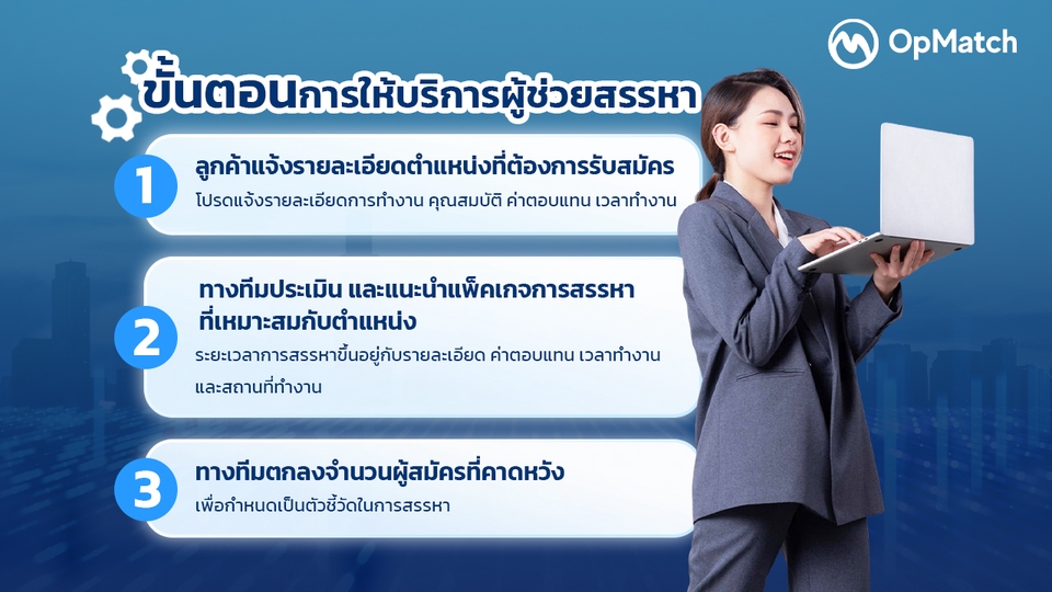 OpMatch คือผู้ช่วยด้านงานบุคคลสำหรับธุรกิจ เราช่วยจัดการงาน HR ที่คุณไม่มีเวลา หรือไม่ถนัด เหมาะสำหรับธุรกิจที่ยังไม่มี HR ประจำ หรืออยากได้ผู้ช่วยที่เข้าใจงาน HR จริง และทำงานได้อย่างมืออาชีพ เราทำงานแบบยืดหยุ่น เหมาะกับธุรกิจยุคใหม่ที่ต้องการความคล่องตัว ลดภาระงาน HR ให้ธุรกิจคุณเดินหน้าได้เร็วขึ้น