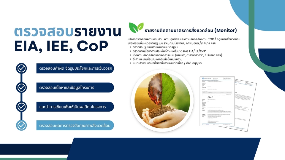 รับตรวจสอบรายงาน EIA, IEE, CoP รายละเอียดบริการ - รับตรวจสอบรายงาน EIA, IEE, CoP โดยผู้เชี่ยวชาญ - ตรวจความถูกต้อง ครบถ้วน ก่อนยื่นรายงาน EIA/IEE/CoP ต่อหน่วยงานรัฐ - ตรวจรายงานติดตามมาตรการสิ่งแวดล้อม (Monitor Report) อย่างมืออาชีพ สิ่งที่ลูกค้าจะได้รับ - รายงานสรุปผลการตรวจสอบ (Checklist + Comment) - คำแนะนำการปรับปรุงรายงานให้ผ่านเกณฑ์ - ให้คำปรึกษาหลังส่งงานภายใน 7 วัน สิ่งที่ลูกค้าต้องเตรียม - ไฟล์รายงาน (Word/PDF) ที่ต้องการให้ตรวจสอบ - รายงานต้นฉบับ EIA/IEE (กรณีตรวจ Monitor Report) - เอกสารแนบ เช่น ตารางผลตรวจวัด, แบบแปลน - TOR หรือเงื่อนไขจากหน่วยงาน (ถ้ามี)
