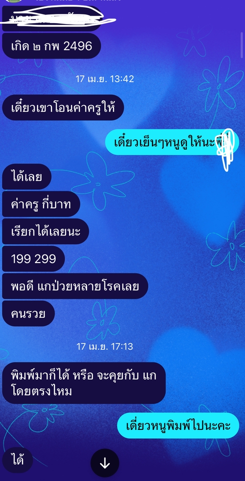 ถ้าคุณคิดถึงใครเราติดต่อให้ ถ้ายังไม่เชื่อลองมาใช้บริการดูซักครั้ง แล้วคุณจะติดใจ ราคาเป็นกันเอง ใครที่ยังมีห่วงกับผู้ที่คุณสูญเสียไป แล้วต้องการจะคุยติดต่อมาเลยค่ะ ขั้นตอนการทำงาน 1. ดูดวง 2. สื่อสารกับวิญญาณ