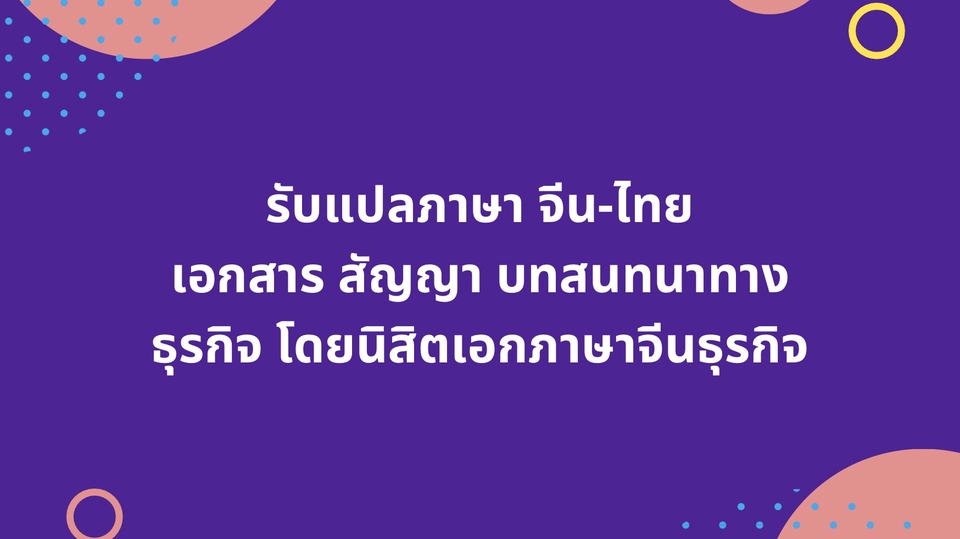 จบจากคณะมนุษยศาสตร์ เอกภาษาจีนธุรกิจ มหาวิทยาลัยเกษตรศาสตร์ สามารถแปลบทสนทนาทางธุรกิจ สัญญาภาษาจีน แปลใบ B/L แปลบทความภาษาจีนเป็นไทย ถนัดด้านเอกสารธุรกิจ คัดตัวอักษรจีน ขั้นตอนการทำงาน 1. แจ้งรายละเอียดของงาน 2. ผู้ทำตรวจสอบและประเมินงาน 3. ตกลงราคา 4. คอมเฟิร์มการเริ่มงาน 5. เริ่มงาน 6. ทำงานตามที่ได้รับมอบหมาย 7. ส่งงานให้ผู้จ้างตรวจ 8. ส่งงานฉบับจริง
