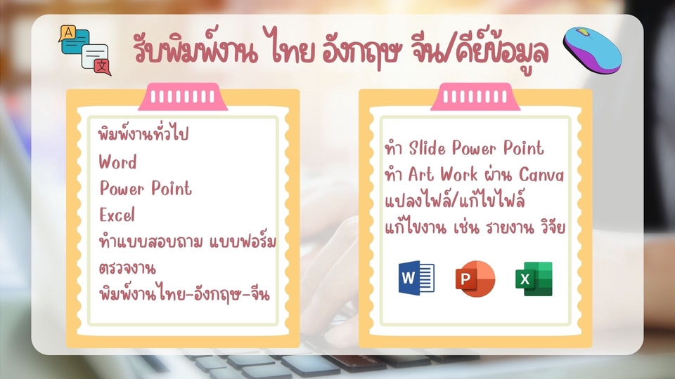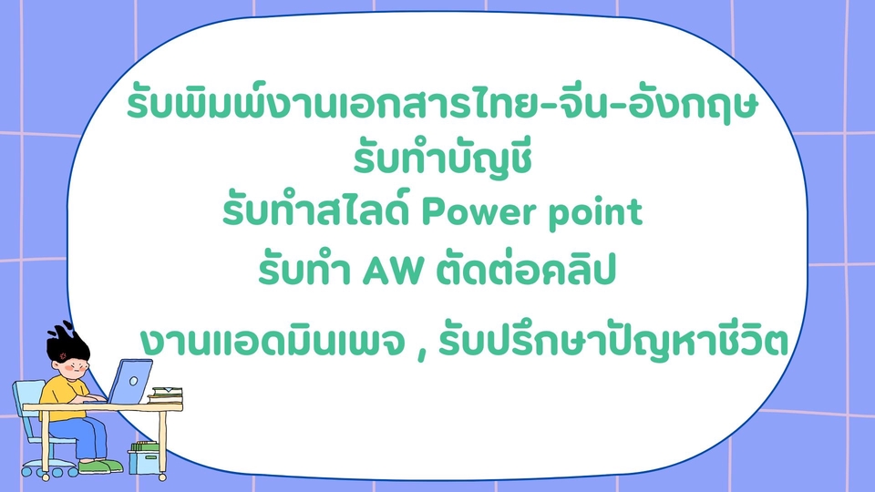รับพิมพ์งาน ไทย-อังกฤษ-จีน รับคีย์ข้อมูล รับทำบัญชี ตกแต่งภาพAW รับทำคลิป รับแก้เอกสารตรวจเอกสาร