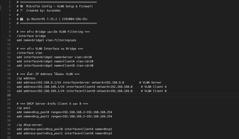 ให้บริการคอนฟิก Mikrotik สำหรับใช้งานอินเตอร์เน็ตทั้งในองค์กรและสถานที่ต่างๆ รองรับการตั้งค่า VPN, Routing, Hotspot, PPPoE และฟีเจอร์อื่นๆ ตามความต้องการของลูกค้า พร้อมให้บริการรีโมทคอนฟิกระยะไกลอย่างปลอดภัยและรวดเร็ว โดยคำนึงถึงความเสถียรของระบบและความปลอดภัยของข้อมูลเป็นหลัก พร้อมให้คำปรึกษาและแนะนำการใช้งานเบื้องต้นหลังติดตั้ง ขั้นตอนการทำงาน 1. คุยรายละเอียดความต้องการของลูกค้า 2. ทำการรีโมท คอนฟิกเข้าระบบ 3. ทดสอบการใช้งาน 4. หลังจากทดสอบแล้ว ส่งงานมีไฟล์ Config RSC เก็บให้ลูกค้า