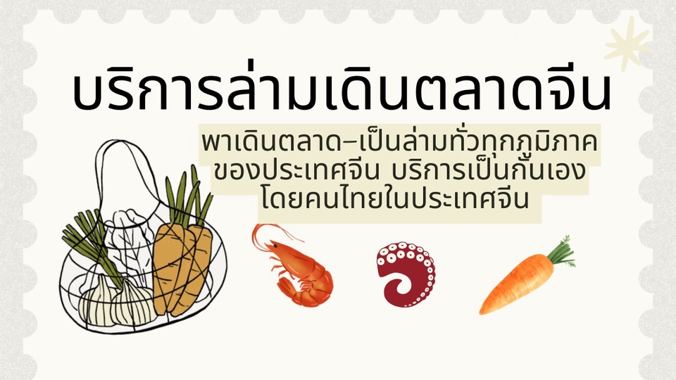 รับพาเดินเที่ยวตลาดทั่วทุกภูมิภาคของประเทศจีน พร้อมเป็นล่ามพาเดินเที่ยว สามารถแนะนำอาหารหรือตลาดที่ลูกค้ามีความสนใจได้ บริการเป็นกันเอง แหล่งอาหารอร่อยและราคาถูก ขั้นตอนการทำงาน 1. แจ้งรายละเอียดตลาดมณฑล/เมือง/ตลาดที่สนใจจะไป 2. แจ้งความต้องการพิเศษหากลูกค้าต้องการรีเควสในการเดินตลาด 3. ดำเนินการนัดหมายสถานที่ วันและเวลา
