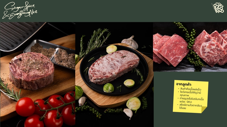 ภาพถ่ายอาหารใช้โปรโมทบน Social Media ของท่านหรือทำเมนูร้านอาหาร บอกเล่าทั้งความน่ากินและตัวตน เพื่อสร้างการจดจำ ข้อมูลที่ต้องการจากลูกค้าก่อนเริ่มงาน 1.ประเภทอาหารและร้านอาหารของลูกค้า (ตัวอย่าง: ติ๋มซำ, ไอศครีม, ทุเรียน) 2.ช่องทางที่ต้องการนำไปโปรโมท, ลักษณะการใช้งาน (ตัวอย่าง: โปรโมทเมนูใหม่ แล้วนำไปปริ๊นต์ขนาดA3, ทำเมนูใหม่) 3.ลักษณะงาน / สไตล์ภาพ ที่ลูกค้าชอบ (ตัวอย่าง:อยากให้เป็นร้านอาหารจีนที่ดูสตรีท แสงธรรมชาติ, อยากให้ไอศครีมดูแฟชั่น, อยากให้อารมณ์ Fine dine ในเมนู) 4.จำนวนเมนู (ตัวอย่าง:มีเมนูทั้งหมด 278 รายการ อยากถ่ายทั้งหมดทำเป็นเมนูภาพ<อันนี้เป็นคำขอจริงๆ>, มีแค่ 1 เมนู แต่อยากจัดออกมา 5 สไตล์ 5 สี)