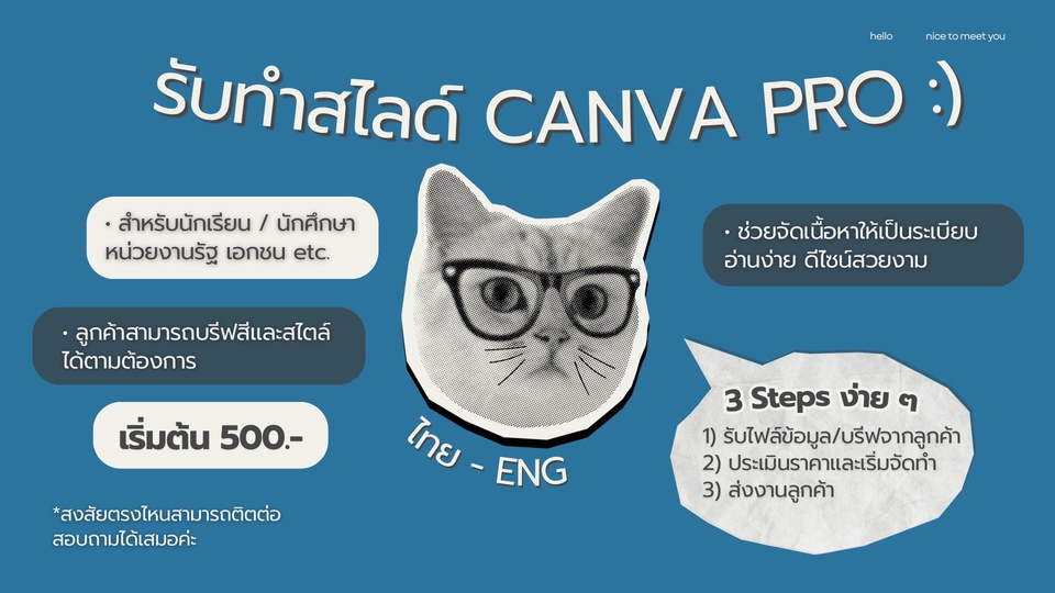 ฿900จำนวนสไลด์ 10-20 หน้า เนื้อหา : ลูกค้าเตรียมเนื้อหา+บรีฟเพิ่มเติม ระยะเวลา : ส่งงานภายใน 3-5 วัน