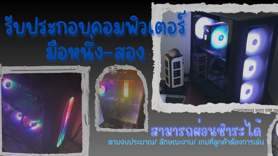 ประกอบคอมพิวเตอร์อุปกรณ์มือสอง/มือหนึ่ง ราคามิตรภาพ - สามารถผ่อนชำระได้ - เครื่องถึงมือก่อนค่อยชำระเงิน - สามารถวางงบประมาณ หรือความต้องการของงานได้ ขั้นตอนการทำงาน 1. พูดคุยรายละเอียดและความต้องการของลูกค้า 2. จัดแจงหาอุปกรณ์คอมพิวเตอร์ตามงบประมาณหรือลักษณะงานที่ใช้/เกมที่อยากเล่น 3. ประกอบเครื่องคอมพิวเตอร์ 4. ลงวินโดว์ให้พร้อมใช้งาน 5. จัดส่งที่บ้านลูกค้า