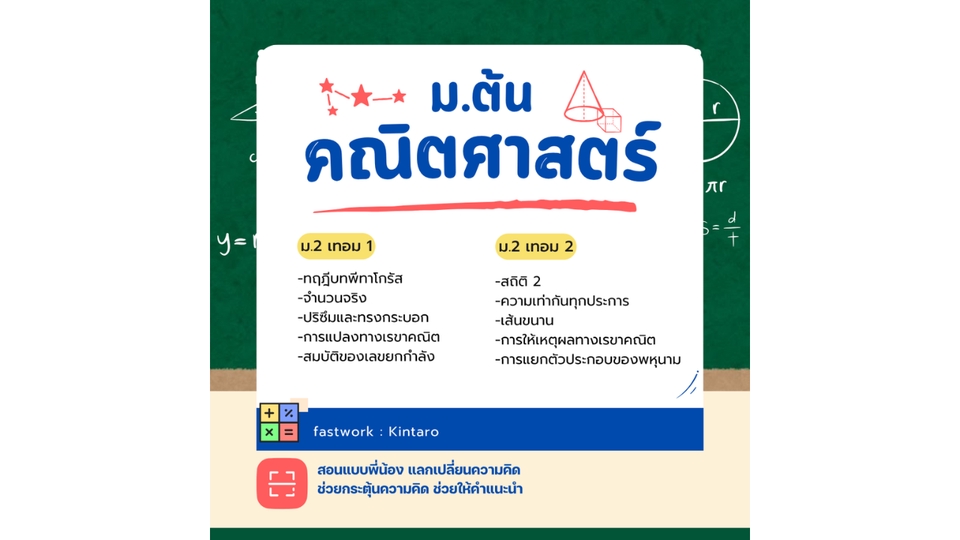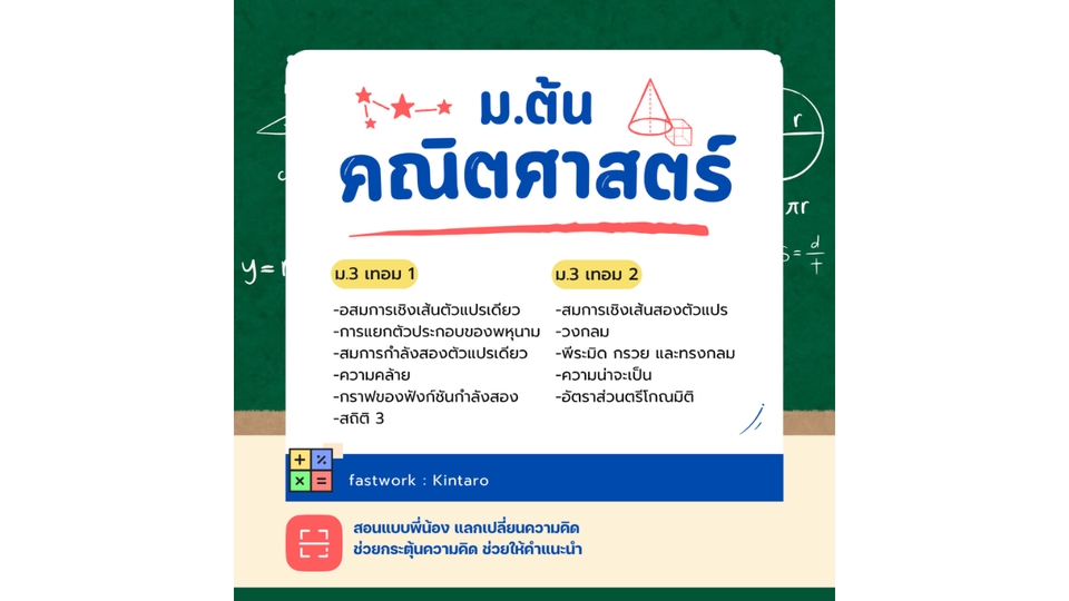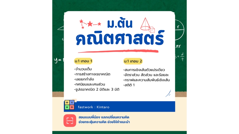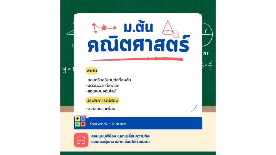 สอนคณิตศาสตร์ ม.ต้น ม.1 (เทอม 1) -จำนวนเต็ม -การสร้างทางเรขาคณิต -เลขยกกำลัง -ทศนิยมและเศษส่วน -รูปเรขาคณิต 2 มิติและ 3 มิติ ม.1 (เทอม 2) -สมการเชิงเส้นตัวแปรเดียว -อัตราส่วน สัดส่วน และร้อยละ -กราฟและความสัมพันธ์เชิงเส้น -สถิติ 1 ม.2 (เทอม 1) -ทฤฎีบทพีทาโกรัส -จำนวนจริง -ปริซึมและทรงกระบอก -การแปลงทางเรขาคณิต -สมบัติของเลขยกกำลัง ม.2 (เทอม 2) -สถิติ 2 -ความเท่ากันทุกประการ -เส้นขนาน -การให้เหตุผลทางเรขาคณิต -การแยกตัวประกอบของพหุนามดีกรีกำลังสอง ม.3 (เทอม 1) -อสมการเชิงเส้นตัวแปรเดียว -การแยกตัวประกอบของพหุนามที่มีดีกรีสูงกว่าสอง -สมการกำลังสองตัวแปรเดียว -ความคล้าย -กราฟของฟังก์ชันกำลังสอง -สถิติ 3 ม.3 (เทอม 2) -สมการเชิงเส้นสองตัวแปร -วงกลม -พีระมิด กรวย และทรงกลม -ความน่าจะเป็น -อัตราส่วนตรีโกณมิติ *สอนหรืออธิบายข้อที่สงสัย *นัดวันเวลาที่สะดวก *สอนแบบออนไลน์ **ประสบการณ์สอน เคยสอนรุ่นเพื่อน
