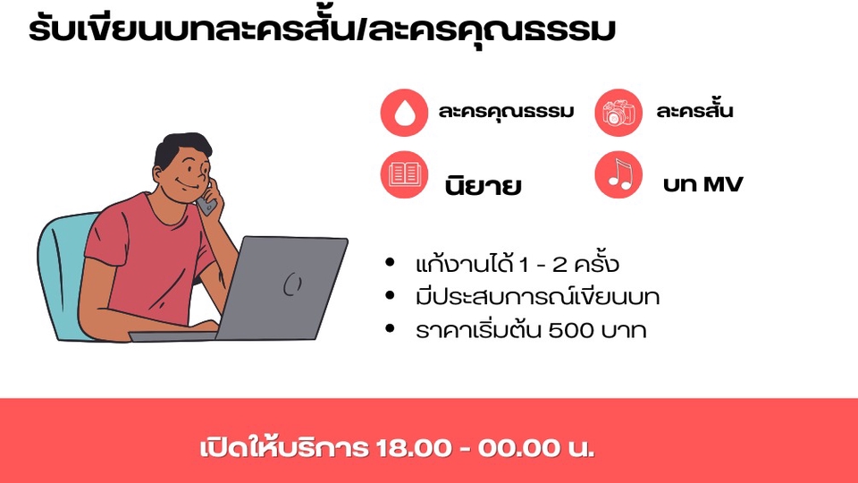 รับเขียนบทละคร พร้อมเรื่องย่อ และบทสนทนา ความยาว 5-7 นาที มีผลงานที่ได้รับเลือกให้ถ่ายทำ และเผยแพร่โดยมียอดการชมมากกว่าหนึ่งแสนครั้ง นอกจากนี้สามารถเขียนบทภาพยนตร์สั้น นิยาย ความยาวตามที่กำหนด ขั้นตอนการทำงาน 1. พูดคุยเรื่องขอบเขตงาน 2. เขียนบท 3. ให้ลูกค้ารีวิว 1 ครั้ง พร้อมบอกความต้องการปรับแก้ 4. แก้ไขตามความต้องการ และส่งงาน 5. ลูกค้าชำระค่าบริการ