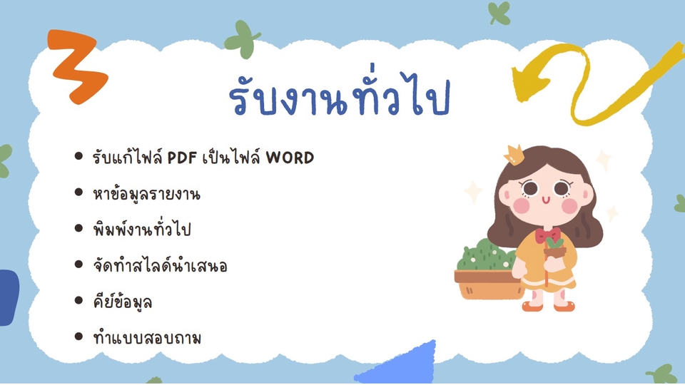 รับแก้ไฟล์ PDF ให้เป็นไฟล์ Word / หาข้อมูลรายงาน / พิมพ์งานทั่วไป / จัดทำสไลด์นำเสนอ / คีย์ข้อมูล ขั้นตอนการทำงาน 1. ติดต่อพูดคุยรายละเอียดถึงงานที่ต้องการว่าจ้าง 2. สำหรับข้อมูลเนื้อหาในการทำงานผู้ว่าจ้างต้องสืบค้นข้อมูลมาเอง 3. เมื่อตกลงตามใบเสนอราคากันเสร็จเรียบร้อย มีระยะเวลาในการทำงาน 4 วัน 4. การปรับแก้ชิ้นงานสามารถปรับแก้ได้ไม่เกิน 2 ครั้ง