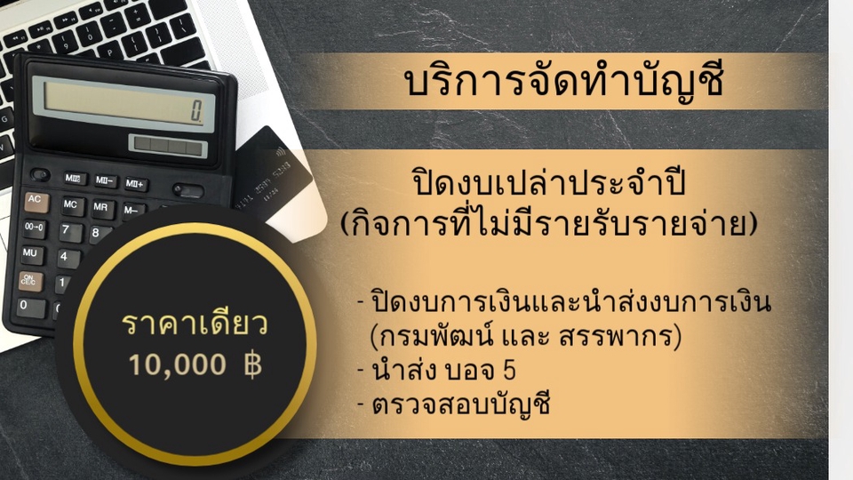 ฿10,000บ.ที่มีรายการไม่เกิน 10 รายการต่อปี - ปิดงบและจัดทำงบการเงิน - ตรวจสอบบัญชี - นำส่งงบการเงินและบอจ5 (กรมพัฒน์ online) - ยื่นภาษีประจำปี (สรรพากร online) - ให้คำปรึกษาอื่นๆ