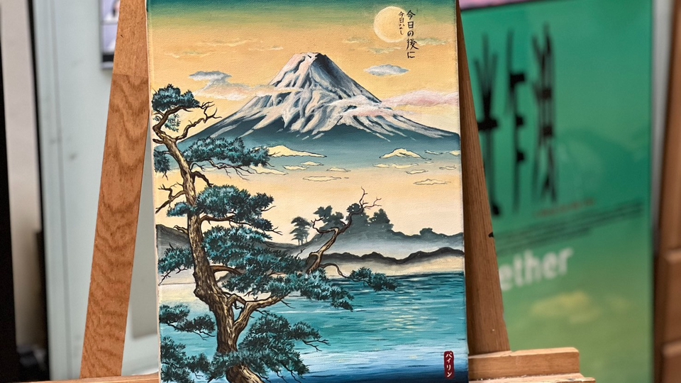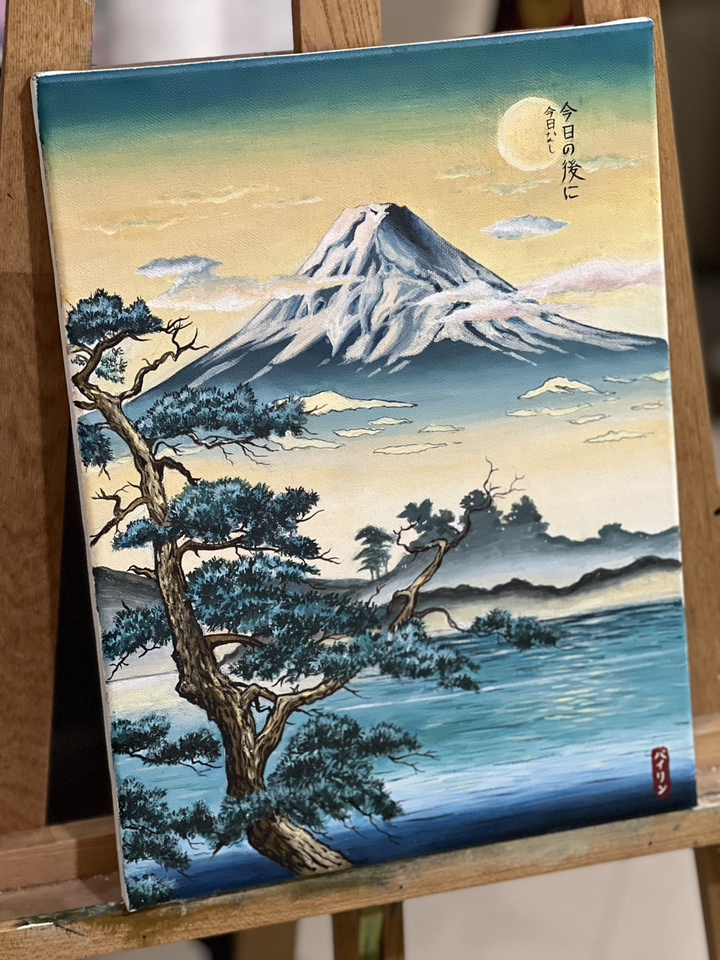 ภาพ Painting สีอะคริลิก ที่ได้รับแรงบันดาลใจจากภาพยนตร์ / หนังสือ / ช่วงเวลาต่าง ๆ ในชีวิต หรือข้าวของต่าง ๆ ที่มีความหมายกับเรา สามารถใช้เป็นของขวัญ ของแต่งห้อง แต่งบ้าน หรือของสะสมได้ค่ะ ขั้นตอนการทำงาน 1. ภาพวาดเริ่มต้นจากกลอนไฮกุของญี่ปุ่น「今日の後に / 今日という日 / そして消ゆ」(After today / the day that once was / then fades away) เป็นแรงบันดาลใจในการสร้างสรรค์ผลงานของความงดงามที่เกิดขึ้นในเพียงชั่วขณะหนึ่งของกาลเวลา 2. ร่างองค์ประกอบของภาพบนกระดาษ เพื่อกำหนดองค์ประกอบทั้งหมดที่จะใส่ในภาพ ได้แก่ ภูเขาไฟ, ทะเลสาบ, ต้นสน, พระจันทร์ 3. ลงสีพื้น โดยการไล่สีพื้นท้องฟ้าและทะเลสาบทั้งหมด 4. ลงสีและรายละเอียดของภูเขาไฟฟูจิ ให้เกิดพื้นผิวที่แตกต่างกันและเพิ่มเงาเพื่อสร้างมิติ 5. ลงสีต้นไม้ด้านหน้า โดยเน้นรายละเอียดที่เห็นชัดเจน 6. เพิ่มรายละเอียด เช่น พระจันทร์ กลอนไฮกุ และลายเซนต์