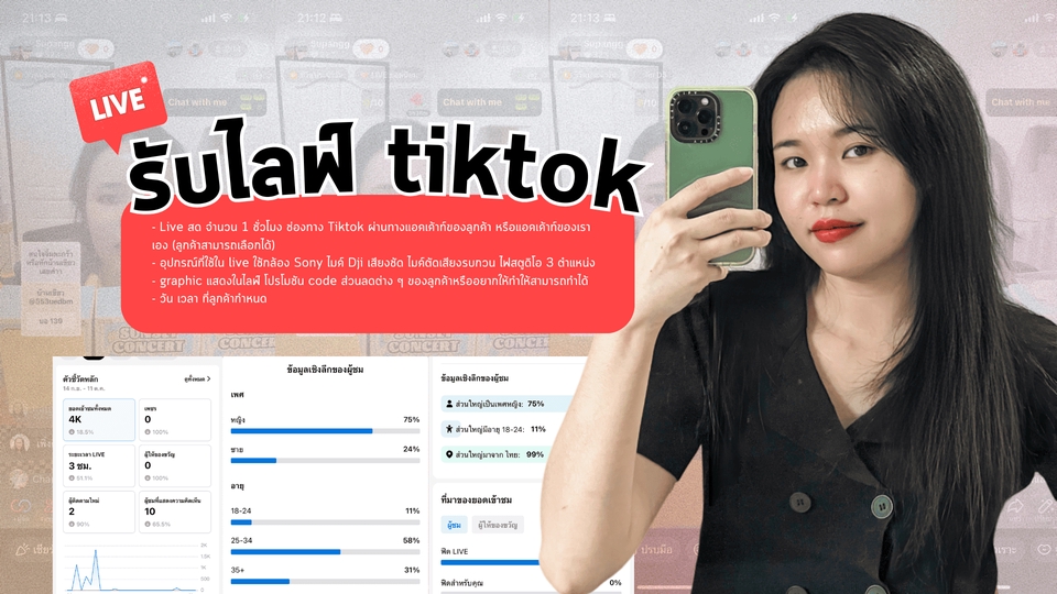฿2,000- Live สด จำนวน 1 ชั่วโมง ช่องทาง Tiktok ผ่านทางแอคเค้าท์ของลูกค้า หรือแอคเค้าท์ของเราเอง (ลูกค้าสามารถเลือกได้) - อุปกรณ์ที่ใช้ใน live ใช้กล้อง Sony ไมค์ Dji เสียงชัด ไมค์ตัดเสียงรบกวน ไฟสตูดิโอ 3 ตำแหน่ง - graphic แสดงในไลฟ์ โปรโมชัน code ส่วนลดต่าง ๆ ของลูกค้าหรืออยากให้ทำให้สามารถทำได้ - วัน เวลา ที่ลูกค้ากำหนด