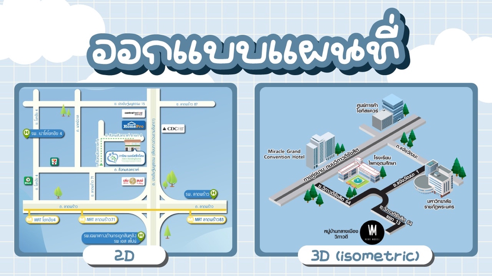 ดูผลงานเพิ่มเติมได้ที่ MAP 2D / 3D https://drive.google.com/drive/folders/1IKmGYf7L19sfOhyA25ILc7T9sJsRO6oz --------------------------------------------------------- รับออกแบบแผนที่ ตามที่คุณต้องการ + ออกแบบตัวอาคารได้ใกล้เคียง มีทั้งแบบ 2D 3D น่ารัก เข้าใจง่าย สามารถแก้ไขได้จนกว่าจะจบงาน ออกแบบได้ตามที่ต้องการ ทั้งโทนสี แนวภาพ ทำได้ตั้งแต่การวาดมือน่ารักๆ ไปจนถึงแผนที่ทางการที่ดูเรียบร้อย ลูกค้าสามารถขอดูผลงานเพิ่มเติมได้ - แผนที่ทั่วไป เช่น ร้านค้า บริษัท บ้าน ออฟฟิต - แผนที่โครงการหมู่บ้าน - แผนที่งานการจัดงาน เช่น งานแต่ง งานสัมมนา งานกิจกรรม - แผนในตัวอาคาร เช่น จุดสำคัญในห้างสรรพสินค้า ขั้นตอนการทำงาน 1. คุยรายละเอียดคร่าวๆเพื่อตีราคา + แก้ระยะเวลาการทำงาน 2. รอการยืนยันยอดเงิน 3. เริ่มทำงาน 4. แก้ไขจนกว่าจะจบงาน (อยู่ในขอบเขตที่คุยตอนแรก) 5. ส่งงาน