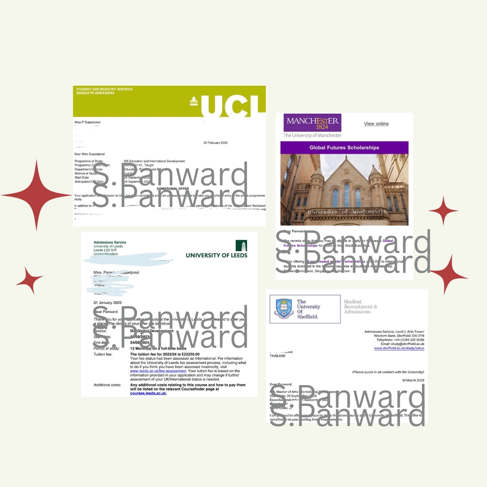 ได้รับ offer จากมหาลัยอันดับท็อปยูพร้อมทุนในประเทศอังกฤษ ไม่ว่าจะเป็น UCL, University of Manchester และอื่นๆ