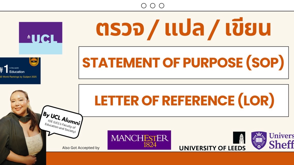เพิ่มโอกาสเข้ามหาวิทยาลัยชั้นนำของคุณ ด้วยบริการร่างและเขียน Statement of Purpose (SOP) และ Letter of Recommendation (LOR) คุณภาพสูง ทำไมต้องเลือกเรา? - ผู้เขียนมืออาชีพจาก UCL: จบปริญญาโทจาก University College London (UCL), Institute of Education (มหาวิทยาลัยอันดับ 1 ของโลกด้านการศึกษา 12 ปีซ้อน จาก QS Ranking) - ประสบการณ์ตรง: ได้รับ Offer พร้อมทุนจาก Manchester University, Universtiy of Leeds และอื่นๆ จึงทำให้เข้าใจสิ่งที่กรรมการคัดเลือกต้องการอย่างแท้จริง - เทรนด์การศึกษาระดับโลก: การศึกษาในสาขา Education ทำให้ผู้เขียนมีโอกาสเรียนรู้และเข้าใจเป็นอย่างยิ่งว่ามหาวิทยาลัยชั้นนำของโลกต้องการเห็นอะไร และต้องการอะไรจากผู้สมัคร โดยเข้าใจเทรนด์การศึกษาระดับโลกอย่างลึกซึ้ง ให้เราช่วยคุณก้าวสู่มหาวิทยาลัยในฝันวันนี้! ขั้นตอนการทำงาน 1. แจ้งข้อมูลและความต้องการเบื้องต้น 2. นัดพูดคุยเพื่อเก็บข้อมูลของผู้ว่าจ้าง 3. ดำเนินการร่าง SOP/LOR 4. ตรวจสอบและแก้ไขเพื่อชิ้นงานที่มีคุณภาพสูงสุด