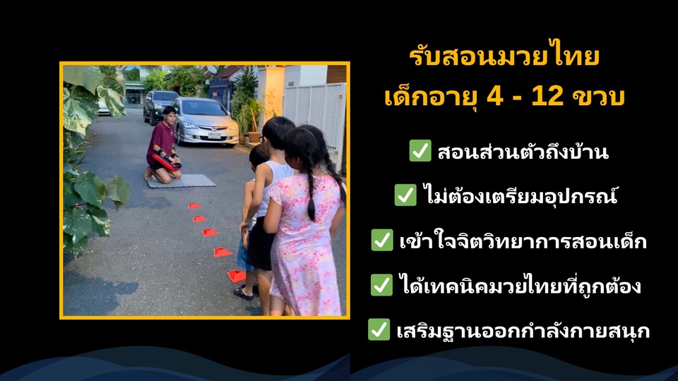 บริการสอนมวยไทยเด็กถึงที่ (บ้าน,คอนโด, ส่วนกลาง, ฟิตเนส และอื่น ๆ) เรียนตัวต่อตัวจำนวน 1 ครั้ง (1.30 ชั่วโมง) - วอร์มอัพ - เรียนเทคนิคมวยไทย - ล่อเป้า - เข้าฐานเสริมสมรรถภาพร่างกาย (Circuit training) - ฝึกประสาทสัมผัสร่างกาย (เสริมความเร็วและการทำงานร่วมกันของร่างกาย - คูลดาวน์ ⭐️ ได้รับสมุดติดตามผลการเรียนระยะยาวทุกแพ็คเกจ 🥊 แบบฝึกหัดมวยเองที่บ้าน เขตที่รับสอน 🚩 นวมินทร์, ประเสริฐมนูกิจ, ลาดพร้าว 87, โพธิ์แก้ว, รามอินทรา, วัชรพล และละแวกใกล้เคียง วัน - เวลาที่สอน ⏰ ทุกวันตั้งแต่ 18.00 - 22.00 วันพุธสอนตั้งแต่ 07.00 - 22.00 ส่งข้อความมาสอบถามรายละเอียดได้ครับ ไม่จ้างไม่เป็นไรครับ