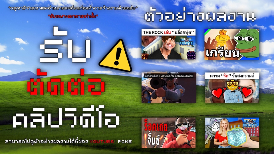 สามารถทำปกคลิปตัดต่อคลิปแนวเกมเกรียนๆ ฮาๆได้ หรือแนวอื่นๆก็สามารถทำได้ ถ้ามีตัวอย่างหรือไกด์ไว้ให้ดู ตัวอย่างสามารถดูได้ที่ Youtube ช่อง PCKz เลยครับ (คลิปที่จะให้ตัดความยาวขอไม่เกิน 10-15 นาที) *คลิปต้นฉบับอาจจะยาวถึง 30 นาทีก็ได้แต่ถ้าตัดแล้วขอให้ยาวไม่เกิน 10-15 นาทีครับ* ขั้นตอนการทำงาน 1. ดราฟงานอยากให้ตัดแนวไหน วิดีโอเป็นยังไง สามารถส่งลิงก์คลิปวิดีโอมาให้ดูได้ 2. ส่งคลิปวิดีโอของคุณที่อยากจะให้ตัดมา แบ่งเป็นโฟลเดอร์ได้ยิ่งดีและเรียงลำดับด้วยได้ยิ่งดี (ส่งทาง Google Drive) 3. เมื่อคุณส่งคลิปวิดีโอที่อยากจะให้ตัดมาแล้วทางเราจะทำการตัดคลิปวิดีโอ โดยมีระยะเวลา 5-10 วัน หากคลิปสั้นก็จะไวและหากเป็นคลิปยาวก็อาจจะนาน 4. หากวิดีโอเสร็จแล้วเราจะทำการทักไปบอกและจะส่งลิงก์ Google Drive ไปให้เพื่อให้ลูกค้า เช็กคุณภาพของงาน 5. หากลูกค้าไม่ชอบหรือต้องการที่จะเปลี่ยน ครั้งแรกเราจะทำใหม่ให้ฟรี (เฉพาะคลิปสั้น) แต่ครั้งต่อไปจะเสียค่าบริการ เพิ่ม 50-300 บาท ตามความยาวของคลิปวิดีโอ 6. เมื่อลูกค้าพอใจกับผลงานของเราแล้ว เราจะทำการส่งลิงก์ไปให้เพื่อให้ท่านได้ดาวน์โหลดและสามารถนำไปใช้ง่ายได้ ทาง Google Drive