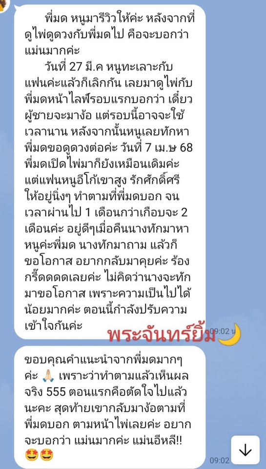 “เพราะชีวิตไม่มีบทเรียนล่วงหน้า แต่ดวงชะตาช่วยบอกทางได้” ✨ ยินดีต้อนรับสู่บริการดูดวงกับ แม่หมอพระจันทร์ยิ้ม หมอดูสายเข้าใจหัวใจคน ใช้ศาสตร์โหราศาสตร์ไทยแท้และไพ่เป็นเครื่องมือเปิดแผนที่ชีวิต เพื่อให้คุณเข้าใจจังหวะชีวิต รู้ว่าควรก้าวเมื่อไหร่ หยุดพักเมื่อใด และปรับดวงให้ชีวิตสมดุล วิเคราะห์ พื้นดวงชะตาตามวัน-เดือน-ปี-เวลาเกิด อย่างละเอียด ดูเรื่อง การงาน การเงิน ความรัก สุขภาพ โชคลาภ จุดเปลี่ยนในชีวิต บอก ช่วงเวลาที่ดี-ควรระวัง และแนวทางเสริมดวงเฉพาะคุณ ตอบคำถามเฉพาะเรื่องที่คุณกังวล เช่น ความสัมพันธ์ ธุรกิจ การตัดสินใจสำคัญ มีบริการเสริม: เสริมดวง แนะนำฤกษ์มงคล ปรับพลังชีวิตตามจังหวะดวง 🧘 เหมาะกับใคร? คนที่รู้สึก "หลงทาง" อยากเข้าใจตัวเอง คนที่กำลังมีคำถามในใจ แต่ไม่แน่ใจทางออก คนที่ต้องการวางแผนอนาคตด้วยพลังดวงชะตา สายมูเตลูที่เชื่อในพลังจักรวาลและจังหวะชีวิต ✨ จุดเด่นของการดูดวงกับแม่หมอพระจันทร์ยิ้ม: ไม่ใช่แค่ทำนาย แต่ ตีความและให้คำแนะนำ แบบเข้าใจง่าย ใช้ได้จริง ศาสตร์ไทยโบราณที่แม่นยำและลึกซึ้ง แต่ถ่ายทอดอย่างเป็นกันเอง ทุกดวงชะตา วิเคราะห์ด้วยใจ เหมือนเป็นคนในครอบครัว วิเคราะห์ดวง + ตอบคำถามเฉพาะทาง 🔐 ความเป็นส่วนตัว: ข้อมูลทุกอย่างของคุณคือความลับ ไม่มีการเปิดเผยที่ไหนทั้งสิ้น คุณสามารถพูดคุยกับฉันได้อย่างสบายใจ 💬 ขั้นตอนการทำงาน 1. ขั้นตอนการจ้างงานดูดวง (โหราศาสตร์ไทย โทรสด) กับ “แม่หมอพระจันทร์ยิ้ม” 🔮เลือกแพ็กเกจที่ต้องการ 🔹 แพ็กเกจเปิดใจ 35 นาที – 888 บาท 🔹 แพ็กเกจลงลึก 45 นาที – 999 บาท 🔹 แพ็กเกจครบเครื่อง 60 นาที – 1,111 บาท 2. แจ้งข้อมูลวันเดือนปีเกิด พร้อมเวลาเกิด (ถ้าทราบ) และจังหวัดที่เกิด เพื่อใช้ในการผูกดวงตามศาสตร์ไทยอย่างแม่นยำ 3. ชำระเงินเพื่อจองคิว โอนเงินตามราคาแพ็กเกจที่เลือก และแจ้งหลักฐานการชำระเงิน (พร้อมเลขบัญชีหรือช่องทางการชำระจะส่งให้ลูกค้าทางแชท) 4. นัดวัน-เวลาโทรดูดวง เลือกวันและเวลาที่สะดวก ทั้งลูกค้าและแม่หมอ จากนั้นจะยืนยันคิวอย่างเป็นทางการ 5. รับบริการดูดวงผ่านโทรศัพท์ พูดคุยสด วิเคราะห์ตรงจุด ได้คำตอบครบถ้วน พร้อมคำแนะนำที่ใช้ได้จริง 6. รับสรุปผลดูดวง (ถ้ามี) แม่หมอสามารถส่งสรุปผลดูดวงให้เป็นข้อความ หรือไฟล์ PDF หลังจบการดูดวง (ตามแพ็กเกจ) 7. บริการติดตามผล (เฉพาะแพ็กเกจ 1,111) ลูกค้าสามารถทักมาเพิ่มเติมภายใน 7 วัน เพื่อสอบถามหรือขอคำแนะนำเสริมเพิ่มเติม 8. 📌 หมายเหตุ: ข้อมูลของลูกค้าจะถูกเก็บเป็นความลับ 100% หากต้องการเปลี่ยนวัน-เวลานัด กรุณาแจ้งล่วงหน้าอย่า