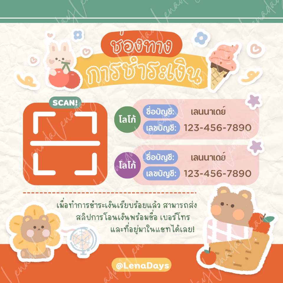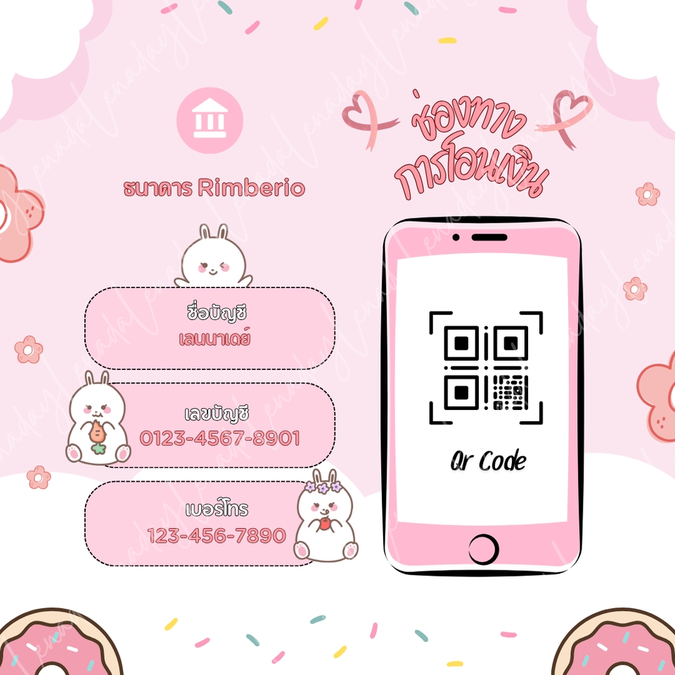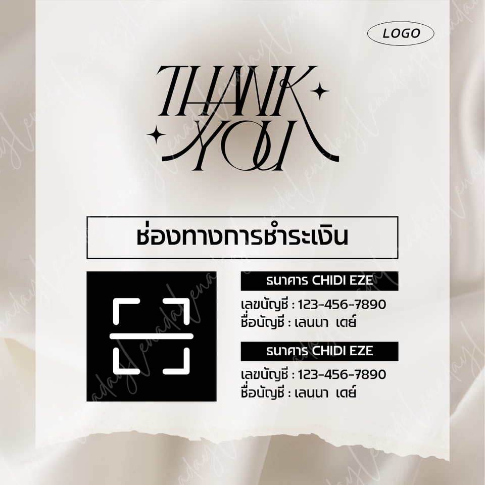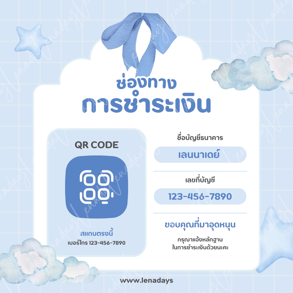 ลูกค้าสามารถแจ้งแก้ไขข้อความได้ตามใจชอบ - แจ้งชื่อ บช. และหากต้องการใส่เลข บช. แบบเต็ม สามารถแจ้งเลข บช. เลขพร้อมเพย์ ได้เลย - แจ้งรายละเอียดเพิ่มเติมที่อยากให้ใส่ในป้าย เช่น ชื่อร้าน เบอร์โทร เป็นต้น ขั้นตอนการทำงาน 1. แจ้ง รายละเอียดที่ต้องการให้ใส่ในภาพ เช่น ชื่อ บัญชี ธนาคาร ชื่อร้านค้า เบอร์โทร 2. แจ้งรูป QR Code 3. อื่นๆ ที่ลูกค้าต้องการใส่ เช่น โลโก้ร้าน