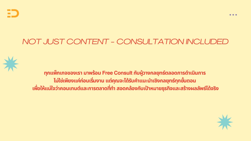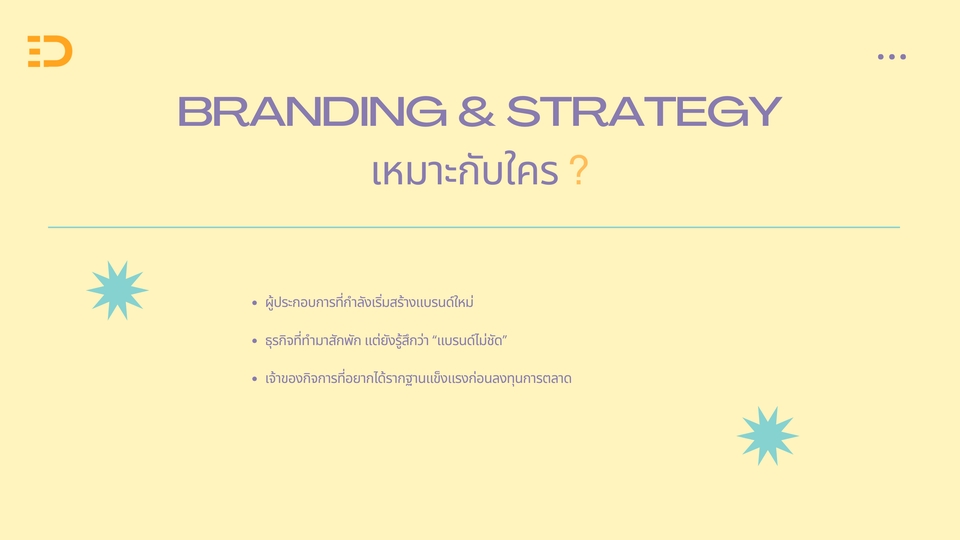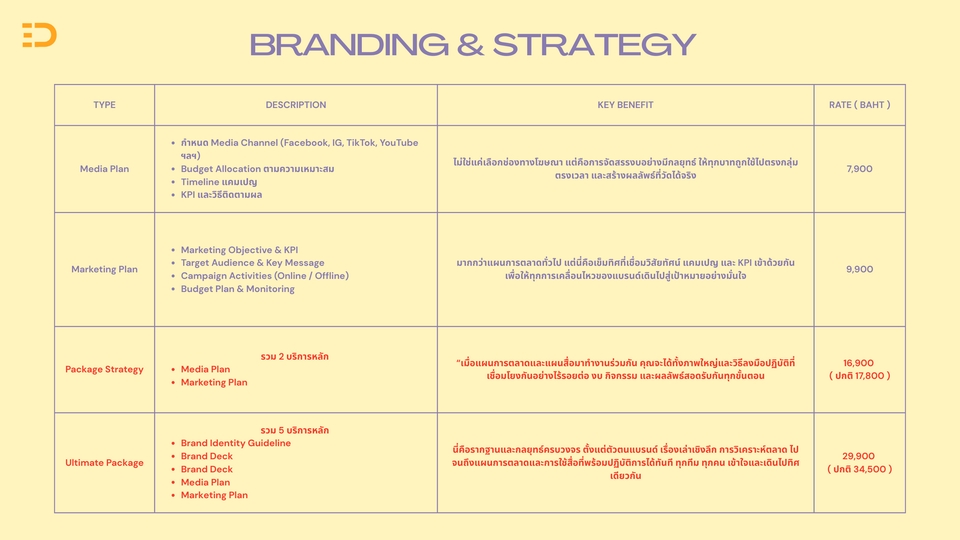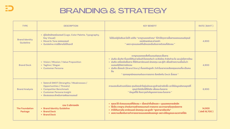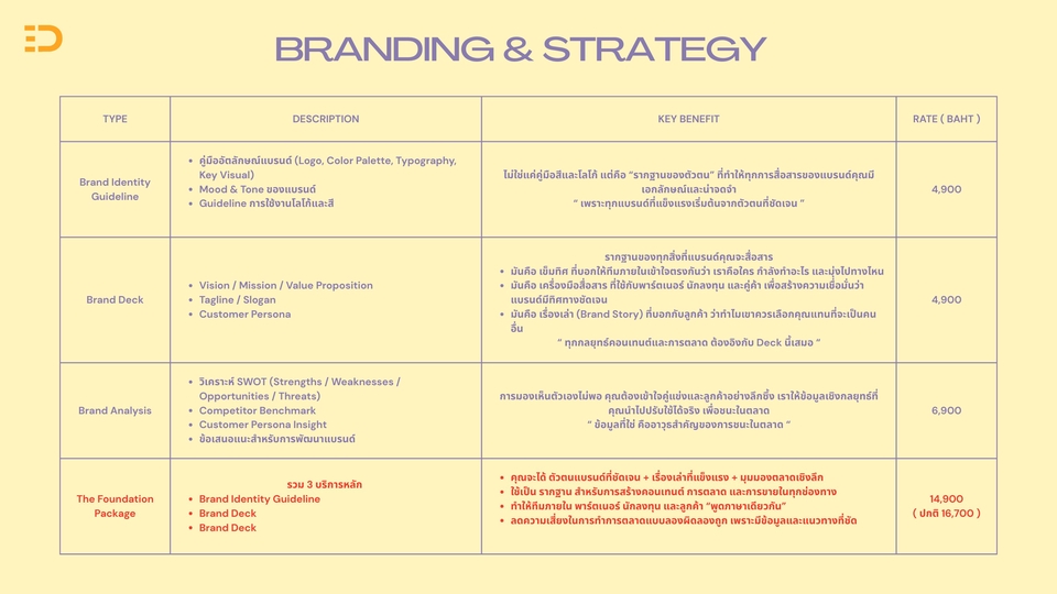 ทุกแพ็กเกจมาพร้อม Free Consult กับผู้วางกลยุทธ์ ตลอดการดำเนินงาน :) เพื่อให้มั่นใจว่าผลลัพธ์ที่ได้ สามารถตอบโจทย์ธุรกิจ และสร้างจุดยืนที่เอาชนะคู่แข่งได้จริง ! 1️⃣ Brand Identity Guideline – 4,900 บาท คู่มืออัตลักษณ์แบรนด์ที่ช่วยให้ทุกการออกแบบและการสื่อสารไปในทิศทางเดียวกัน - โลโก้และการใช้งานที่ถูกต้อง - ชุดสีหลัก–สีรอง (Color Palette) - ฟอนต์ (Typography) - Mood & Tone การสื่อสาร 📍 ประโยชน์ 📍 ทำให้แบรนด์มีตัวตนชัดเจนและใช้งานได้ต่อเนื่องทุกช่องทาง 2️⃣ Brand Deck – 4,900 บาท เอกสารนำเสนอที่สรุป “เรื่องราวและทิศทางของแบรนด์” เอาไว้ในที่เดียว - Vision (ภาพอนาคตที่แบรนด์อยากไปถึง) - Mission (สิ่งที่แบรนด์ทำเพื่อไปถึงเป้าหมาย) - Value Proposition (เหตุผลที่ลูกค้าต้องเลือกคุณ) - Tagline / Slogan - Customer Persona (กลุ่มลูกค้าเป้าหมายชัดเจน) 📍 ประโยชน์ 📍 ใช้สื่อสารกับทีม นักลงทุน หรือคู่ค้า ให้เข้าใจแบรนด์ได้ทันที 3️⃣ Brand Analysis – 6,900 บาท - การวิเคราะห์เชิงกลยุทธ์เพื่อให้เข้าใจตลาดและโอกาสการเติบโตของแบรนด์ - SWOT Analysis (จุดแข็ง จุดอ่อน โอกาส ความเสี่ยง) - Competitor Benchmark (เปรียบเทียบคู่แข่ง) - Customer Insight (เจาะลึกพฤติกรรมและความต้องการลูกค้า) - ข้อเสนอแนะเชิงกลยุทธ์สำหรับการพัฒนาแบรนด์ 📍 ประโยชน์ 📍 เห็นภาพรวมตลาดชัดขึ้น ลดการลองผิดลองถูก และหาทางเติบโตได้ตรงจุด 📦 Package Branding รวม 3 บริการ : Brand Identity Guideline + Brand Deck + Brand Analysis เหมาะสำหรับธุรกิจที่ต้องการรากฐานแบรนด์ชัดเจน มีตัวตน เรื่องเล่า และการวิเคราะห์ตลาดครบในที่เดียว ปกติ 16,700 บาท → พิเศษเพียง 14,900 บาท !