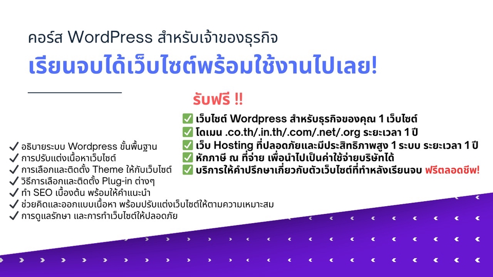 ถ้าคุณเป็นเจ้าของธุรกิจขนาดเล็ก ที่กำลังประสบปัญหาเหล่านี้ ❌ ไม่มีเว็บไซต์ของธุรกิจ ที่ทำให้ดูหน้าเชื่อถือ 💸 ทุนน้อย มีงบจำกัด 🤷♀️ อยากมีเว็บไซต์ แต่ทำไม่เป็น ไม่มีความรู้เลย ให้เราช่วยคุณวันนี้! เราไม่ใช่แค่สอน แต่จะสอนและปรับเว็บไซต์ไปพร้อมกับคุณแบบตัวต่อตัว ตามความต้องการของผู้เรียน ทำให้คุณมีเว็บไซต์ธุรกิจของคุณเอง ในราคาที่ย่อมเยาว์ และจับต้องได้ เราจะสอนการใช้งานในรูปแบบต่างๆ ทั้งด้านการใช้งาน และการป้องกันจากภัยคุกคามออนไลน์ในปัจจุบัน รวมไปถึงการแชร์เทคนิคต่างๆ เพื่อที่คุณจะไปดูแลเว็บไซต์ต่อเองได้อย่างมั่นใจ รายละเอียดคอร์สต่างๆ สามารถดูได้ดังต่อไปนี้ Value Course: https://1drv.ms/i/s!AjB8c_eX1NWkpesuj0OfVwMRobTf1Q?e=QvzRAf - 9,900 บาท Premium Course: https://1drv.ms/i/s!AjB8c_eX1NWkpesvxRx7hiufyLhONw?e=qLEvTr - 16,000 บาท Ultimate Course: https://1drv.ms/i/s!AjB8c_eX1NWkpesw16zUnXQMaq_6yQ?e=7iDYPi - 29,000 บาท ขั้นตอนการทำงาน 1. ผู้เรียนติดต่อสอบถามผู้สอนถึงคิวเรียนที่ว่างพร้อมข้อมูลสอบถามอื่นๆ เพิ่มเติม และแจ้งความประสงค์กรณีต้องการหักภาษี ณ ที่จ่าย 2. ผู้เรียนซื้อคอร์สและชำระเงินผ่านแพลตฟอร์ม 3. ผู้สอนส่ง Link Google Meet ณ วันที่ผู้เรียนเลือกลงวันเรียนไว้ 4. ผู้สอนติดต่อผู้เรียนขอข้อมูลต่างๆ ที่ต้องการ ทั้งชื่อเว็บไซต์ รูปแบบเว็บโดยรวม Logo เว็บไซต์หรือบริษัท ฯลฯ 5. ผู้เรียนเตรียมข้อมูลที่ต้องการจะนำลงเว็บไซต์ ไม่ว่าจะเป็นเนื้อหา หรือรูปภาพต่างๆ ที่ต้องการนำขึ้นเว็บไซต์ 6. ก่อนวันเรียน 1 วัน ผู้สอนจะทำการจดทะเบียนโดเมนเนม และเตรียมเว็บ Hosting สำหรับประกอบการสอน 7. หลังเรียนเสร็จแล้ว ผู้เรียนยังสามารถติดต่อสอบถามและปรึกษาผู้สอนได้ผ่านแพลตฟอร์ม โดยไม่มีค่าใช้จ่าย