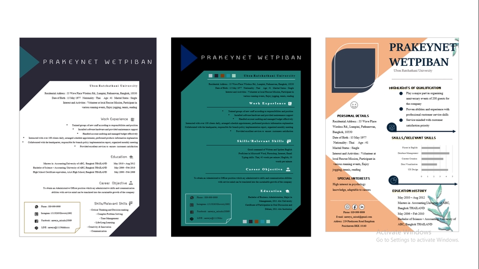 RESUME สำหรับสมัครงานและสำหรับการใช้เข้ามหาวิทยาลัย ไม่ว่าจะเป็นสายงานไหน คณะอะไรก็สามารถใช้ได้ เนื้อหามีทั้งภาษาไทย และภาษาอังกฤษ หากต้องการปรับแก้ส่วนไหนสามารถพูดคุยหรือบอกรายละเอียดทางเเชท fastwork ได้ หากต้องการรูปเเบบอื่นก็สามารถทำได้ โดยเรามีเรซูเม่ให้ท่านเลือกมากกว่า 50แบบ ขั้นตอนการทำงาน 1. สอบถามความต้องการของลูกค้า 2. แนะนำสินค้าให้ลูกค้า เผื่อลูกค้ามีแบบอื่นที่สนใจ 3. ขอข้อมูลเพื่อทำใส่รายละเอียดให้ลูกค้า 4. ส่งงานให้ลูกค้า 5. สอบถามความพึงพอใจของลูกค้า 6. แก้ไขข้อมูลตามคามต้องการของลูกค้า 7. ส่งงานที่ลูกค้าพึงพอใจเเล้ว