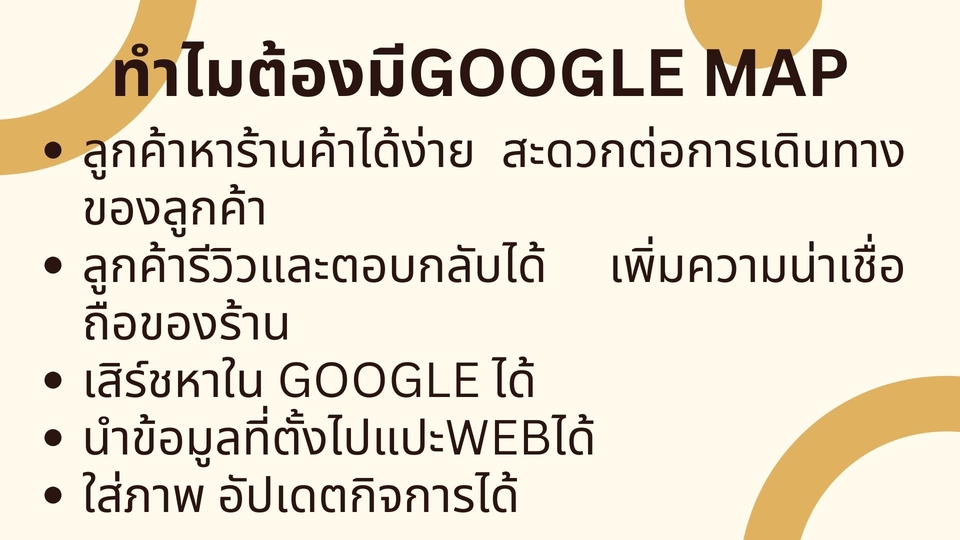 รับสร้างบัญชีธุรกิจ Google My Business ใน Google Maps ช่วยเปิดการมองเห็นร้านค้าในGoogle Search และ Google Maps ทำให้ลูกค้าค้นหาร้านค้าของคุณได้ง่ายขึ้น 📍ข้อดีของการปักหมุดใน Google Maps - ลูกค้าหาร้านค้า / ธุรกิจของคุณได้ง่ายขึ้น เข้าถึงลูกค้ากลุ่มใหม่ๆ ได้ดีขึ้น - สะดวกต่อการเดินทางของลูกค้า - เสิร์ชหาใน Google ได้ - แสดงเมนู ราคา โปรโมทร้าน - นำข้อมูลที่ตั้งไปแปะเว็ปได้ - ใส่ภาพ อัปเดตกิจการได้ ขั้นตอนการทำงาน 1. ลูกค้าแจ้งความต้องการ ลักษณะที่อยากให้แสดงใน Google Maps 2. ส่งใบเสนอราคาให้อนุมัติ 3. ดำเนินการสร้างGoogle Maps 4. ส่งให้ลูกค้าตรวจสอบ 5. ลูกค้ากดอนุมัติงาน