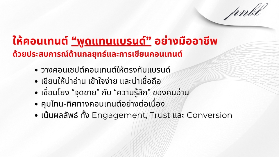 ✍🏻 บริการเขียนคอนเทนต์สำหรับสื่อโซเชียลมีเดีย เหมาะสำหรับ Facebook, IG และ Website พร้อมวางโครงเรื่อง คีย์แมสเสจ และถ้อยคำที่ตรงกับแบรนด์ เนื้อหาอ่านง่าย กระชับ น่าแชร์ ตอบโจทย์ทั้ง Engagement, Trust และ Conversion ✔️ สามารถคิดคอนเซปต์ตามธีม หรือแคมเปญที่ต้องการได้ ✔️ สื่อสารจุดเด่นสินค้า/บริการอย่างชัดเจน ✔️ ปรับโทนภาษาได้หลายสไตล์ (Friendly / Professional / Funny / Luxury / etc.) ✔️ รองรับทั้งโพสต์ข้อความเดี่ยว อัลบั้ม และโพสต์แบบ Motion -------------------------------------------- ระยะเวลาดำเนินการ 3-7 วัน (หลังชำระเงิน) -------------------------------------------- 🔄 ขั้นตอนการทำงาน: Content Writing Service 1.รับบรีฟและพูดคุยรายละเอียด – เข้าใจแบรนด์ เป้าหมาย และสไตล์ที่ต้องการ – รวบรวมข้อมูลสินค้า/บริการ, แคมเปญ, หรือธีมคอนเทนต์ 2.วางแนวทางคอนเทนต์และคีย์เมสเสจ – คิดธีมหลักและหัวข้อย่อยตามแพ็กเกจที่เลือก – เสนอไอเดียแนวโพสต์ / รูปแบบ (Single / Album / Motion) 3.เขียนคอนเทนต์และส่งร่างแรก – เขียนโพสต์ตามโครงสร้าง พร้อมปรับโทนภาษาตามบรีฟ – ส่งร่างให้ตรวจสอบรอบแรก 4.ปรับแก้ตามคำแนะนำ (2 รอบ) – รับฟัง feedback และปรับให้ตรงใจที่สุด – ตรวจสอบความถูกต้องของข้อมูลและสำนวน 5.ส่งมอบงาน Final พร้อมจัดฟอร์แมตโพสต์ – ส่งไฟล์พร้อมใช้งาน (.docx / Google Docs หรืออื่น ๆ ตามตกลง) – แนบคำแนะนำการใช้ หรือ caption guideline หากมี -------------------------------------------- 📌 แพ็กเกจบริการ Rate : Content Writer * 6 Content post = 4,800 THB Single post 4 | Album post 2 * 9 Content post = 7,000 THB Single post 6 | Album post 2 | Motion post 1 * 15 Content post = 9,900 THB Single post 8 | Album post 3 | Motion post 1 -------------------------------------------- หรือนอกเหนือจากนี้ สามารถใช้บริการ Custom package ได้ Single post : 800/post Album post : 900/post Motion post : 1,200/post -------------------------------------------- แถม FREE ‼️ Keyword Research (SEO) ทุกคอนเทนต์ -------------------------------------------- 🚫 หมายเหตุ ไม่รับงานที่เกี่ยวข้องกับเนื้อหาผิดกฎหมาย การพนัน ความรุนแรง หรือขัดต่อจริยธรรม