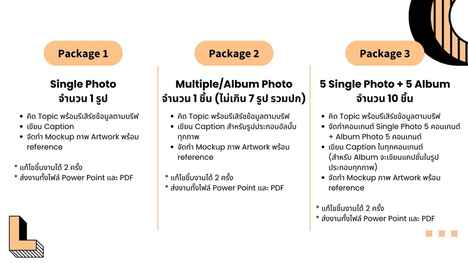 ฿1,500คิดและเขียน Content : Multiple/Album Photo 1 ชิ้น ไม่เกิน 7 ภาพ (รวมปก) 📍 คิด Topic พร้อมรีเสิร์ชข้อมูลตามบรีฟ 📍 เขียน Caption สำหรับรูปประกอบอัลบั้มทุกภาพ 📍 จัดทำ Mockup ภาพ Artwork พร้อม reference * แก้ไขชิ้นงานได้ 2 ครั้ง * ส่งงานทั้งไฟล์ Power Point และ PDF