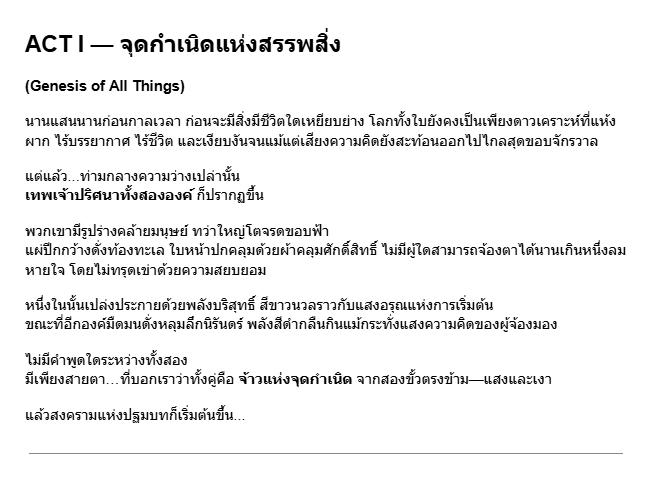 รับเขียนเนื้อเรื่องเกม วางโครงเรื่อง ออกแบบเควสต์ บทสนทนา และ Lore ให้เกมของคุณมีมิติน่าติดตาม มีตัวอย่างผลงานที่ได้รับอนุญาตให้เผยแพร่ ทั้งแนวแฟนตาซีแบบ Epic และโปรเจกต์ที่ผสมเควสต์กับบทพูดเพื่อใช้ในเกมจริง ไม่ว่าจะเป็นแนวไหนหรือบรีฟเฉพาะทางแค่ไหน ผมพร้อมสื่อสารให้เรื่องราวของคุณมีชีวิตครับ ตัวอย่างผลงาน : https://docs.google.com/document/d/1zzVjTDVRKAzoD4SCu6NiAnPKlL3afzprliPxdK12TMI/edit?usp=sharing ขั้นตอนการทำงาน 1. พูดคุยแนวทาง/รับบรีฟ : สอบถามแนวเกม เป้าหมาย เนื้อเรื่องเบื้องต้น หรือไอเดียของลูกค้า 2. เสนอไอเดียเนื้อเรื่องหรือโครงเรื่องเบื้องต้น : ย่อยบรีฟให้เป็นคอนเซปต์ พร้อมเสนอทิศทางให้เลือก 3. เริ่มเขียนเนื้อหา (Lore / Quest / Dialogue) : สร้างเนื้อหาให้ตามแพ็กเกจที่ลูกค้าเลือก 4. ส่งงานให้ตรวจสอบ : ส่งเป็นไฟล์ตัวอย่าง เพื่อให้ลูกค้าอ่านและเสนอปรับแก้ 5. ปรับแก้ตามฟีดแบ็ค(ถ้ามี) : ดำเนินการปรับแก้ตามจำนวนครั้งที่ระบุในแพ็กเกจ 6. ส่งไฟล์งานฉบับสมบูรณ์ : ส่งงานขั้นสุดท้ายในรูปแบบไฟล์ .docx หรือ .pdf ตามที่ตกลงกันไว้
