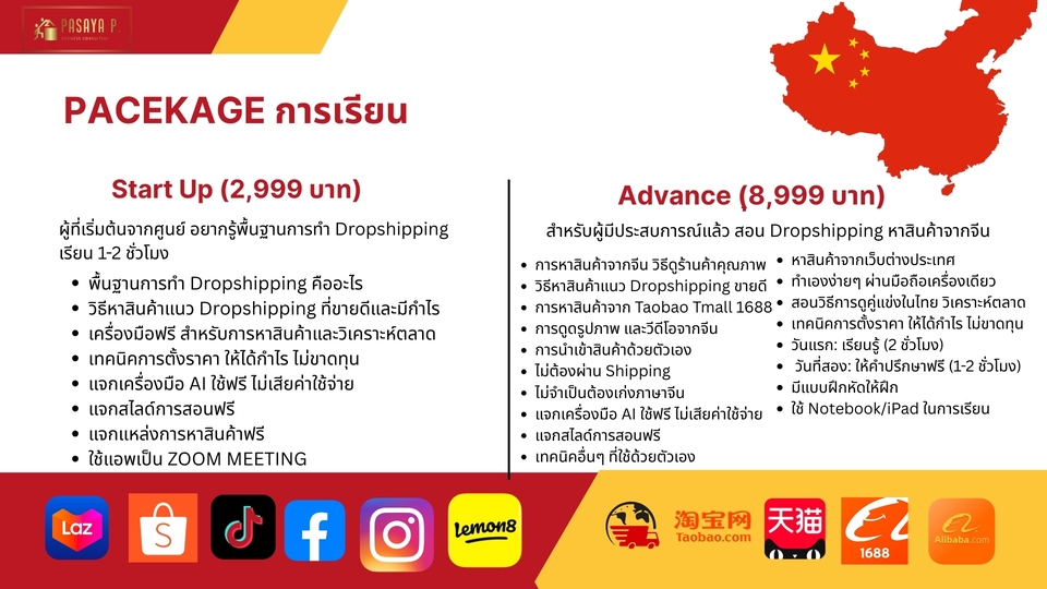 ฿7,999สำหรับผู้มีประสบการณ์แล้ว สอน Dropshipping หาสินค้าจากจีน -การหาสินค้าจากจีน วิธีดูร้านค้าคุณภาพ -วิธีหาสินค้าแนว Dropshipping ขายดี -การดูดรูปภาพ และวีดีโอจากจีน -การนำเข้าสินค้าด้วยตัวเอง -ไม่ต้องผ่าน Shipping -ไม่จำเป็นต้องเก่งภาษาจีน -แจกเครื่องมือ AI ใช้ฟรี ไม่เสียค่าใช้จ่าย -แจกสไลด์การสอนฟรี -สอนวิธีการดูคู่แข่งในไทย -เทคนิคการตั้งราคา ให้ได้กำไร ไม่ขาดทุน 1. วันแรก: เรียนรู้ (2 ชั่วโมง) 2. วันที่สอง: ให้คำปรึกษาฟรี (1-2 ชั่วโมง) มีแบบฝึกหัดให้ฝึก ใช้ Notebook/iPad ในการเรียน