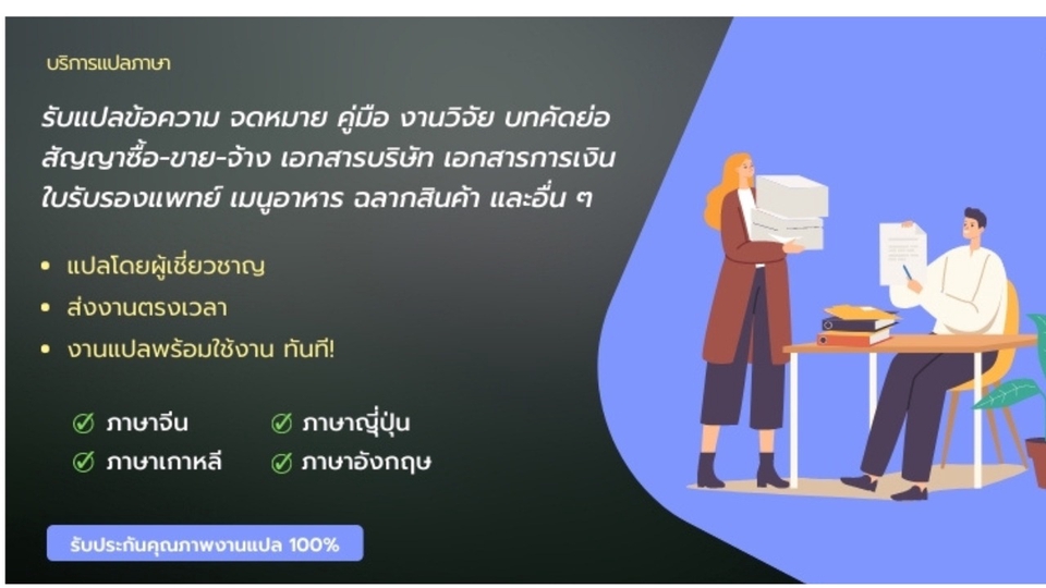 บริการรับแปลภาษาด่วน โดยมีทีมนักแปลหลากหลายภาษาดังต่อไปนี้ - รับแปลภาษาอังกฤษ - รับแปลภาษาจีน (ทีมนักแปลเจ้าของภาษา) - รับแปลภาษาญี่ปุ่น (ทีมนักแปลระดับ N1) ที่มีประสบการณ์ในการแปลเอกสารหลายรูปแบบ ตัวอย่างเช่น - เอกสารสัญญา - เอกสารราชการ - คู่มือ - เอกสารด้านบัญชี - เอกสารบริษัท ข้อตกลงบริษัท - โบรชัวร์ - เมนูอาหาร - บทคัดย่อ - ข้อความทั่วไป งานแปลมีการตรวจสอบและทบทวนก่อนทำการส่งทุกครั้ง พร้อมมีการจัดแบบฟอร์มให้เหมือนต้นฉบับมากที่สุด รับประกันงานคุณภาพ สามารถนำไปใช้ได้จริง และส่งมอบงานตามระยะเวลาที่กำหนด พร้อมแก้ไขฟรี ไม่คิดค่าบริการเพิ่ม ขั้นตอนการทำงาน 1. ส่งไฟล์ประเมินราคา 2. ชำระค่าบริการก่อนเริ่มงาน 3. ส่งมอบงานแปลเป็นไฟล์ pdf และ word เท่านั้น