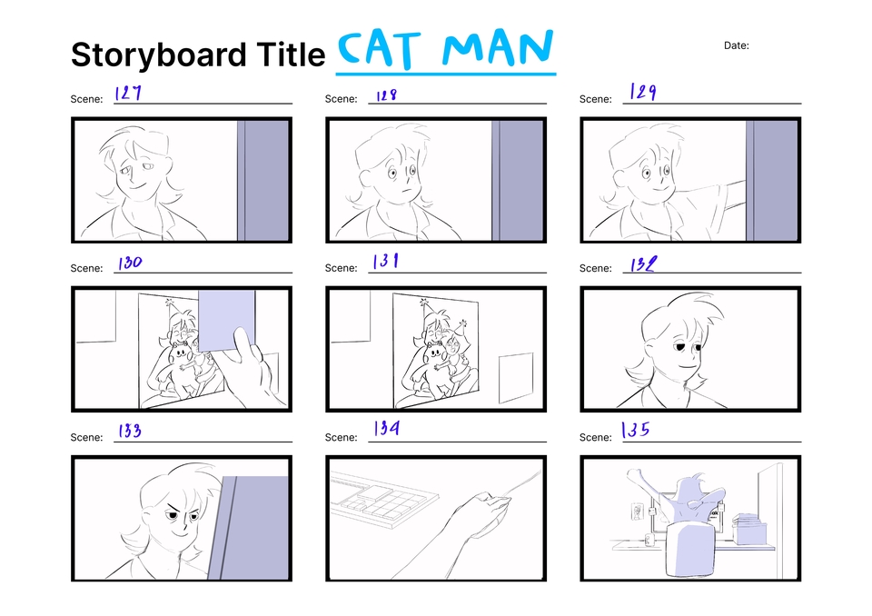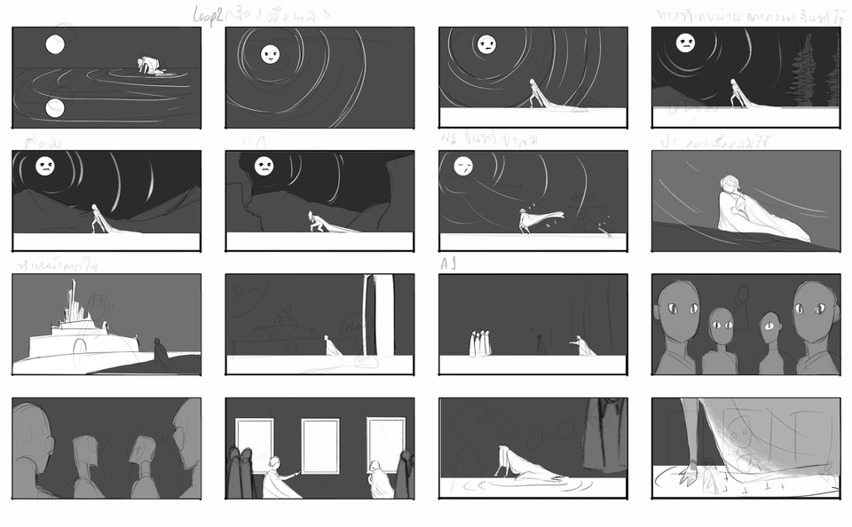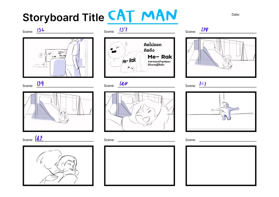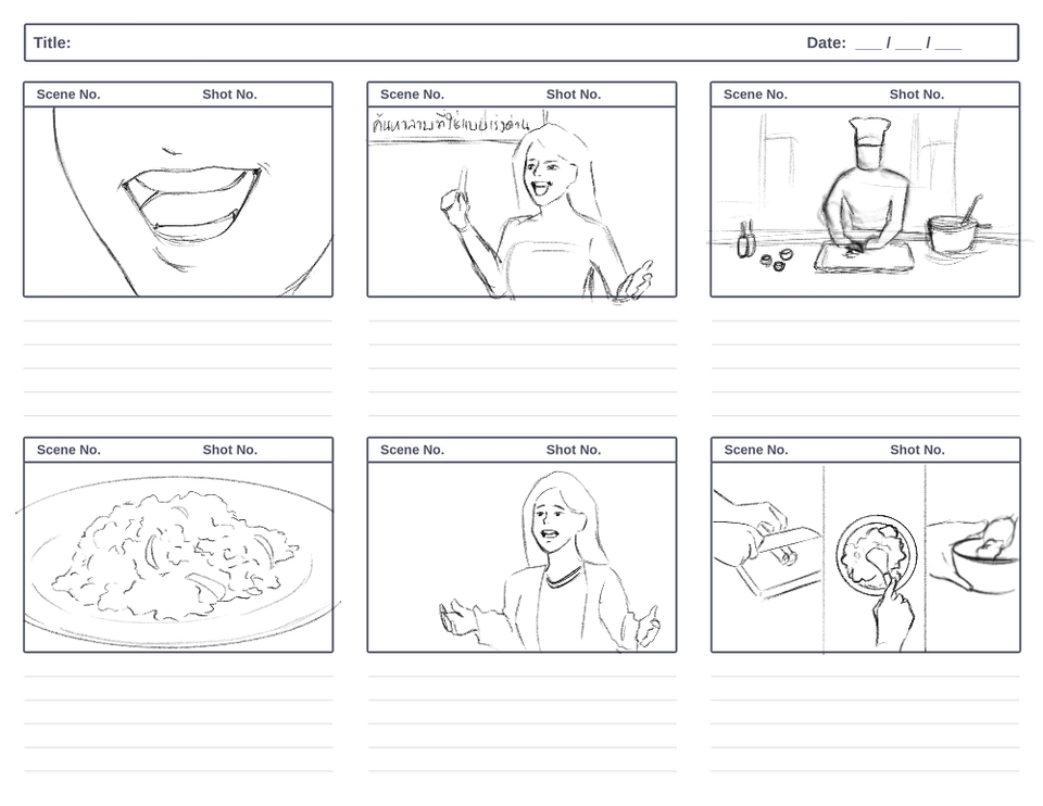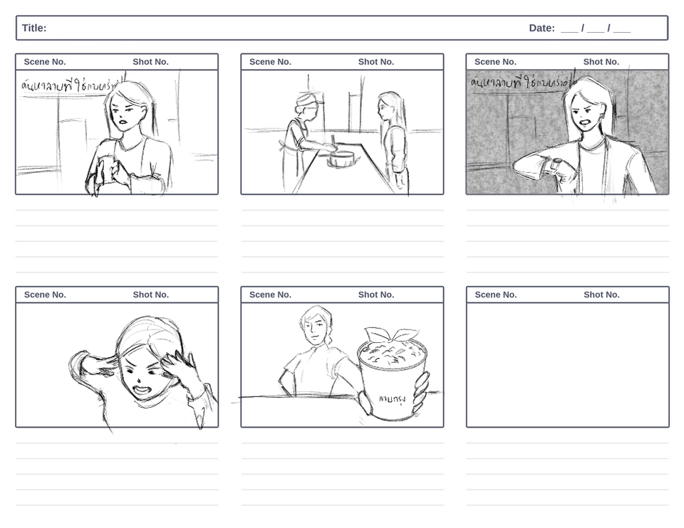 Storyboard สำหรับ Pre-production โฆษณา MV ภาพยนตร์ โดยนักวาดที่จบจากสายแอนเมชั่น ภาพยนตร์โดยตรง ลายเส้นน่ารักอ่านง่าย สามารถวาดแนวสมจริงได้ ขั้นตอนการทำงาน 1. พูดคุยเพื่อเข้าใจความต้องการและรวบรวมข้อมูล 2. สร้างร่างแบบโดยใส่คำบรรยายและปรับปรุงตามคำแนะนำ 3. เริ่มวาด 4. ส่งงานให้ตรวจสอบและแก้ไข 5. ส่งมอบงานพร้อมไฟล์ที่ตกลงไว้ สิ่งที่ต้องการจากผู้ว่าจ้าง 1. บรีฟโยละเอียด สามารถเป็นข้อความบอกท่าทาง หรือรูปประกอบได้ 2. Mood and Tone เนื้อหาที่ต้องการเล่าเรื่อง