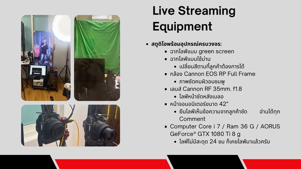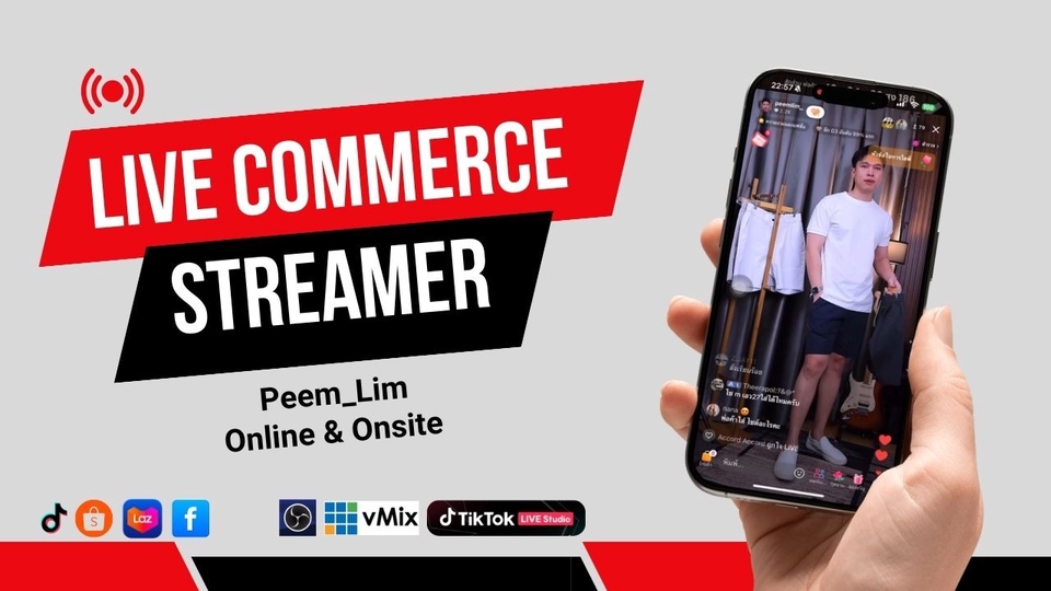 พีมครับ ไลฟ์สดขายสินค้าทุก platform อย่างมืออาชีพ ผ่านทุกแพลตฟอร์ม 🔥 live ผ่านโปรแกรม Live streaming ทุกโปรแกรม OBS / VMix / Tiktok studio 🔥 Live พร้อมกันสูงสุด 6 ช่องทาง *แต่อาจจะละเมิดกฏบาง Platform 🔥 live ผ่าน tiktok / shopee / lazada / facebook สตูดิโอพร้อมอุปกรณ์ครบวงจร: ได้ทั้งแบบยืนไลฟ์ และนั่งไลฟ์ ✨ ฉากไลฟ์แบบ green screen ✨ ฉากไลฟ์แบบใช้ม่าน ✅ เปลี่ยนสีตามที้ลูกค้าต้องการได้ ✨ กล้อง Cannon EOS RP Full Frame ✅ ภาพชัดคมผิวอมชมพู ✨ เลนส์ Cannon RF 35mm. f1.8 ✅ ไลฟ์หน้าชัดหลังเบลอ ✨ ไมโครโฟน ติดกล้อง Boya By MM1+ / ไมค์ Wireless Saramonic Blink 500Pro ✨ หน้าจอมอนิเตอร์ขนาด 42" ✅ ยืนไลฟ์ไกลๆก็เห็นข้อความจากลูกค้าชัด อ่านได้ทุก Comment ✨ Computer Core i 7 / Ram 36 G / AORUS GeForce® GTX 1080 Ti 8 g ✅ไลฟ์ไม่มีสะดุด 24 ชม ก็เคยไลฟ์มาแล้วครับ ขั้นตอนการทำงาน 1. กำหนดชั่วโมง/Slot การไลฟ์ ตกลงราคา 2. จัดทำใบเสนอราคา / ยืนยันการว่าจ้าง 3. ลูกค้าส่งสินค้าตัวอย่าง หรือรูปภาพสินค้า บรีฟรายละเอียดสินค้าและข้อมูลต่างๆ 4. จัดส่งสินค้าคืนเมื่อไลฟ์จบ 5. ลูกค้าชำระเงินส่วนที่เหลือ