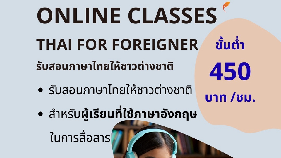 ฿900-เหมาะสำหรับนักเรียน/นักศึกษาต่างชาติ ที่ต้องการเรียนเสริม/ใช้ภาษาไทยในการเรียน - เรียนอย่างน้อย 2 ชั่วโมง (ชั่วโมงละ 450 บาท) - เลือกเวลาเรียนได้ตามสะดวกทั้ง 2 ฝ่าย