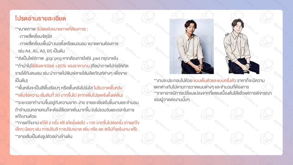 สไตล์งานเป็นดังภาพตัวอย่าง ไม่มีพื้นหลังหรือมีพื้นหลังเป็นสีพื้นเรียบๆ **ไม่รับวาดพื้นหลัง** **ไม่มีบริการใส่กรอบ ส่งเป็นไฟล์ภาพ .jpg หรือ .png** ถ้าชอบลายเส้นของเราลองติดต่อสอบถามกันได้ค่ะ เกิดข้อผิดพลาดประการใดขออภัยคุณลูกค้าทุกท่านมา ณ ที่นี้ **ห้ามนำผลงานของฟรีแลนซ์ไปแอบอ้างเป็นของผลงานตนเอง** <ขอขอบคุณทุกท่านที่สนใจผลงาน และใช้บริการนะคะ> รายละเอียดราคาเพิ่มเติม # ภาพเดี่ยว ราคา 350 บาท # ภาพ 2 คนขึ้นไป เพิ่มคนละ 250 บาท # เพิ่มข้อความ เริ่มต้นที่ 20 บาท # แก้ได้ 2 ครั้ง ฟรี แก้ครั้งต่อไป +100 บาทขึ้นไปต่อครั้ง (การแก้ไขเล็กๆ น้อยๆ เช่น การปรับสี การปรับขนาด เพิ่ม หรือ ลด แค่ไม่กี่จุดในงาน ฟรี) #ราคาอาจมีการเพิ่ม-ลดได้ขึ้นอยู่กับการพิจารณาต่องานนั้นๆ ขั้นตอนการทำงาน 1. ลูกค้าส่งบรีฟงาน/บอกรายละเอียดงาน ขอรูปภาพต้นแบบที่จะให้วาดเป็นรูปที่เห็นหน้าตาท่าทางชัดเจน ถ้านำไปใช้เชิงพาณิชย์โปรดแจ้ง 2. ลูกค้าแจ้งขนาดภาพที่ต้องการให้วาด ขนาดเท่าไหร่ เป็นภาพสี่เหลี่ยมจัตุรัสหรือผืนผ้า(แนวตั้งหรือแนวนอน) มีข้อความหรือไม่มี สีของพื้นหลังสีอะไรหรือเป็นพื้นหลังโปร่งใส (.png) 3. เมื่อคุยรายละเอียดต่างๆและคุณลูกค้าตกลงจ้างงานแล้วจะทำการส่งใบเสนอราคาให้เพื่อชำระเงิน หลังจากลูกค้าชำระเงินแล้วฟรีแลนซ์จะเริ่มทำงาน 4. ฟรีแลนซ์ส่งงานให้ลูกค้าตรวจสอบ 5. หากมีการแก้ไขงาน ฟรีแลนซ์จะทำการแก้ไขงานแล้วส่งงานกลับให้ลูกค้าตรวจสอบ การแก้ไขงาน แก้ได้ 2 ครั้ง ฟรี แก้ครั้งต่อไป +100 บาทขึ้นไปต่อครั้ง (การแก้ไขเล็กๆ น้อยๆ เช่น การปรับสี การปรับขนาด เพิ่มหรือลดแค่ไม่กี่จุดในงาน ฟรี) 6. ลูกค้าอนุมัติงาน และทำการรีวิวฟรีแลนซ์
