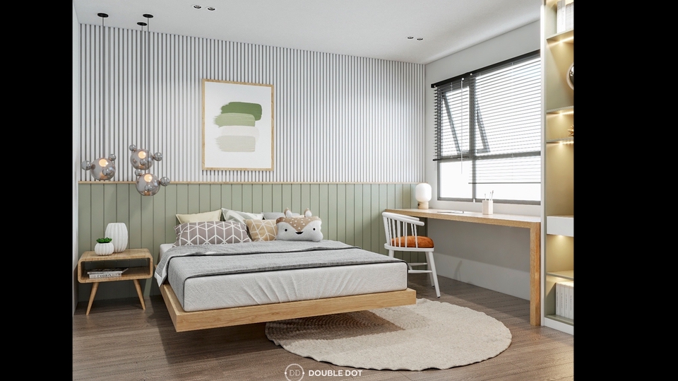 ห้องนอนเป็นสิ่งสำคัญ เวลาเหนื่อยจากการทำงานแล้วได้กลับมาพักผ่อนด้วยความสบายกายสบายใจ เังนั้นการออกแบบเลือกสีโทนห้องนอนถือเป็นสิ่งสำคัญ ยิ่งห้องนอนเด็กยิ่งสำคัญ ต้องคำนึงถึงความปลอดภัย และโทนสีต่างๆเพราโทนสีสามารถช่วยในการเรียนรู้ของเด็กเพิ่มมากขึ้น ขั้นตอนการทำงาน 1. คุยแนวทางในการออกแบบ ความต้องการของลูกค้า ข้อตกลงและรายละเอียดต่างๆในการจ้าง 2. ทำแบบเสนอลูกค้า ภายในระยะเวลาที่ตกลงกันไว้ และสามารถปรับแบบได้ตามตกลงกัน 3. เสนอแบบ final พร้อมส่งไฟลล์ภาพ