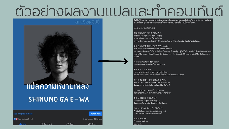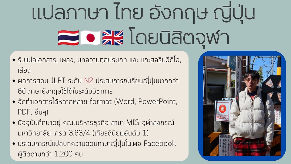 แปลภาษา ไทย, อังกฤษ, ญี่ปุ่น โดยนิสิตจุฬาที่มีประสบการณ์ศึกษาภาษาอังกฤษในระดับวิชาการ, ภาษาญี่ปุ่นระดับ N2 ทำงานไว มืออาชีพ ราคาไม่แรง ใช้เครื่องมือ,แปลง format ได้หลากหลาย แปลได้ทุกอย่างไม่ว่าจะเป็น เอกสาร, บทความ, เพลง, เว็บไซต์, แกะสคริปต์จากเสียง ขั้นตอนการทำงาน 1. ประเมิณรายละเอียดงานและราคา 2. หากตกลงเเล้ว งานแปลไม่เกิน600คำ จะเสร็จภายในสองวัน 3. ส่วนไหนที่แปลเป็นคำไทยตรงๆไม่ได้เราจะตีความเพิ่มเพื่อเพิ่มความเข้าใจให้ 4. แปลเสร็จจะจัดรูปแบบให้เหมาะสมแก่การส่ง