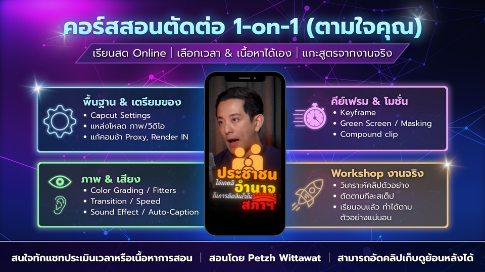 สอนตัดต่อวิดีโอ 1-on-1 (CapCut PC) ฉบับจับมือทำ แกะสูตรงานจริง ตัดเป็นเร็ว อยากตัดต่อคลิปให้ดูโปรฯ มีลูกเล่น แต่ไม่อยากเสียเวลาลองผิดลองถูกเองใช่ไหมครับ? บริการนี้คือคอร์สสอนสดแบบส่วนตัว (Private Coaching) ที่ผมจะ "แกะสูตร" เทคนิคการตัดต่อจากงานจริงให้คุณดูทีละขั้นตอน สอนแบบไม่มีกั๊ก ให้คุณ Copy วิธีคิดและเทคนิคไปใช้ได้ทันที 🎬สิ่งที่คุณจะได้รับ: ✅Live Teaching: เรียนสดผ่าน Online 100% ถาม-ตอบได้ทันที ไม่ใช่ดูคลิปอัด ✅Real Practice: Workshop ด้วยไฟล์งานจริง ฝึกตัดให้เหมือนต้นฉบับเป๊ะๆ ✅Shortcut Techniques: สอนเทคนิคที่ใช้จริงในวงการ (Keyframe, จังหวะ, การเลือกเพลง, Color Grading) โดยไม่เน้นทฤษฎีที่น่าเบื่อ 🛠เครื่องมือที่ใช้: CapCut PC Pro (โปรแกรมฟรี คอมสเปคทั่วไปก็เรียนได้) 💰รูปแบบการเรียน (เลือกได้ตามความต้องการ): ✅รายชั่วโมง: สำหรับผู้ที่ต้องการเน้นเฉพาะบางเทคนิค ✅แพ็กเกจเหมา 3 ชม. (แนะนำ!): สำหรับผู้ที่ต้องการตัดให้ได้แบบคลิปตัวอย่างตั้งแต่ต้นจนจบ ✅เหมาะสำหรับ: มือใหม่, Content Creator, แม่ค้าออนไลน์ หรือผู้ที่อยากอัปสกิลตัดต่อเร่งด่วน