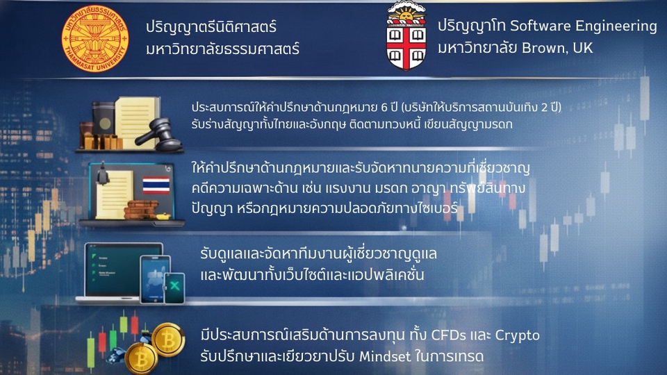 ปริญญาตรีนิติศาสตร์ ม.ธรรมศาสตร์ และปริญญาโท Software Engineering ม.Brown ประสบการณ์ที่ปรึกษากฎหมาย 6 ปี (สถานบันเทิง 2 ปี) รับร่างสัญญาไทย-อังกฤษ ทวงหนี้ และจัดหาทนายเฉพาะทาง ดูแลและจัดหาทีมพัฒนาเว็บและแอป มีประสบการณ์ลงทุน CFDs/Crypto ให้คำปรึกษาและปรับ Mindset การเทรด Customer Service 3 ปี จัดหาบุคลากรดูแลลูกค้า