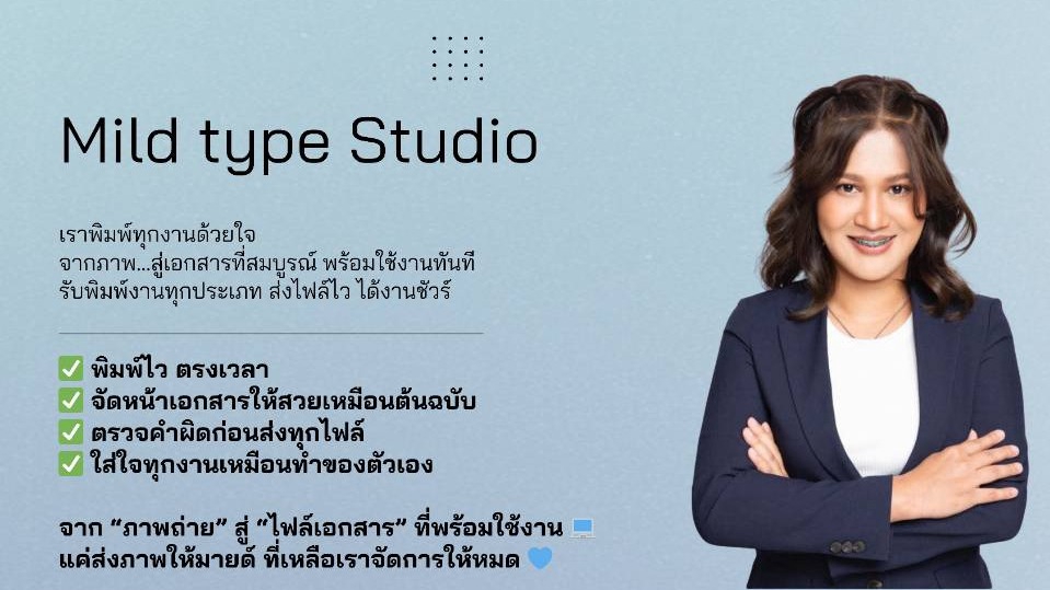 ✨ ทำไมต้องเลือก Mild Type Studio ✨ ✅ พิมพ์ไว ตรงเวลา ✅ จัดหน้าเอกสารให้สวยเหมือนต้นฉบับ ✅ ตรวจคำผิดก่อนส่งทุกไฟล์ ✅ ใส่ใจทุกงานเหมือนทำของตัวเอง จาก “ภาพถ่าย” สู่ “ไฟล์เอกสาร” ที่พร้อมใช้งาน 💻 แค่ส่งภาพให้มายด์ ที่เหลือเราจัดการให้หมด 💙