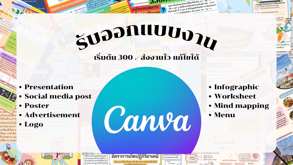 รับทำงานใน canva 🪄 Presentation 🪄 Infographic 🪄 QR Code 🪄 ใบงาน แบบฝึกหัดต่าง ๆ ส่งเป็น link / PDF งานไว แก้ไขได้ ราคาน่ารัก ทักมาคุยกันก่อนได้ค่ะ ขั้นตอนการทำงาน 1. ลูกค้าเสนอรายละเอียดงาน 2. ร้านรับออกแบบ ระยะเวลาขึ้นอยู่กับจำนวนหน้า 3. ส่งตัวอย่างให้ลูกค้า ปรับแก้ได้ 2 ครั้ง หลังจากนั้นเพิ่มครั้งละ50บาท 4. ส่งงานที่เสร็จเรียบร้อยแล้วเป็นไฟล์ pdf และ link canva