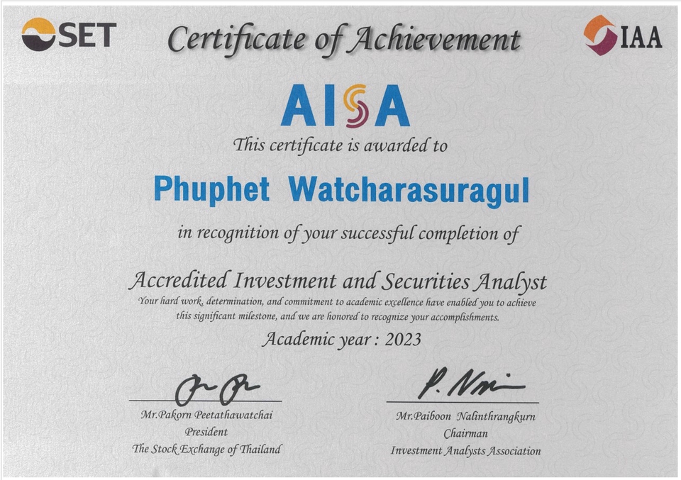 กำลังมองหาที่ปรึกษาการเงินมืออาชีพอยู่หรือเปล่าครับ !!!! สวัสดีครับผม เพชรทำงานเป็นที่ปรึกษาการเงิน และประกันชีวิตร่วมกับบริษัท AIA เลขที่ใบอนุญาต 6701035962 และ IC License เลขที่ 120439 ทั้งนี้ยังเป็นผู้สอบคุณวุฒิ AISA จากตลาดหลักทรัพย์แห่งประเทศไทย และผู้สอบผ่าน CFP (Certified Financial Planner) หลักสูตรที่ 1 และหลักสูตรที่ 2 ซึ่งเป็นคุณวุฒิที่ได้รับการยอมรับมากที่สุด ทั้งในระดับประเทศและระดับโลก เพชรยินดีให้คำปรึกษาการเงินส่วนบุคคลครอบคลุมทุกมิติ ได้แก่ - การวางแผนภาษี - การวางแผนประกันชีวิต / ประกันสุขภาพ - การวางแผนเกษียณ - การวางแผนการศึกษาบุตร - การวางแผนการออม / การลงทุน - การวางแผนส่งต่อมรดก โดยแนวทางการทำงานจะเริ่มต้นด้วยการพูดคุยรายละเอียด/เป้าหมาย/มุมมองทางการเงินของผู้รับคำปรึกษา หลังจากนั้นเพชรจะจัดทำแผนการเงินเป็นไฟล์ PDF 1 ไฟล์ ให้กับผู้รับคำปรึกษาพร้อมทั้งอธิบายถึงรายละเอียดต่างๆ และผู้รับคำปรึกษาสามารถปรับแผนเพิ่มเติมได้ไม่จำกัดจำนวนครั้ง ขั้นตอนการทำงาน 1. พูดคุยเพื่อรวบรวมข้อมูล เป้าหมาย มุมมองในอนาคต รวมไปถึงสถานการณ์ทางการเงินของผู้รับคำปรึกษา ใช้เวลาประมาณ 1 ชั่วโมง 2. จัดทำรายงานทางการเงินส่วนบุคคลตามความต้องการและสถานการณ์ของผู้รับคำปรึกษา 3. นำเสนอแผนการเงิน พร้อมคำอธิบายถึงประเด็นต่างๆ ที่จะช่วยให้ผู้รับคำปรึกษาไปถึงเป้าหมาย 4. ปรับแผนการเงินเพิ่มเติมหลังจากการนำเสนอ (ถ้าผู้รับคำปรึกษาต้องการเปลี่ยนแปลง) 5. ติดตามแผนทางการเงินเป็นประจำอย่างน้อยปีละ 1 ครั้ง